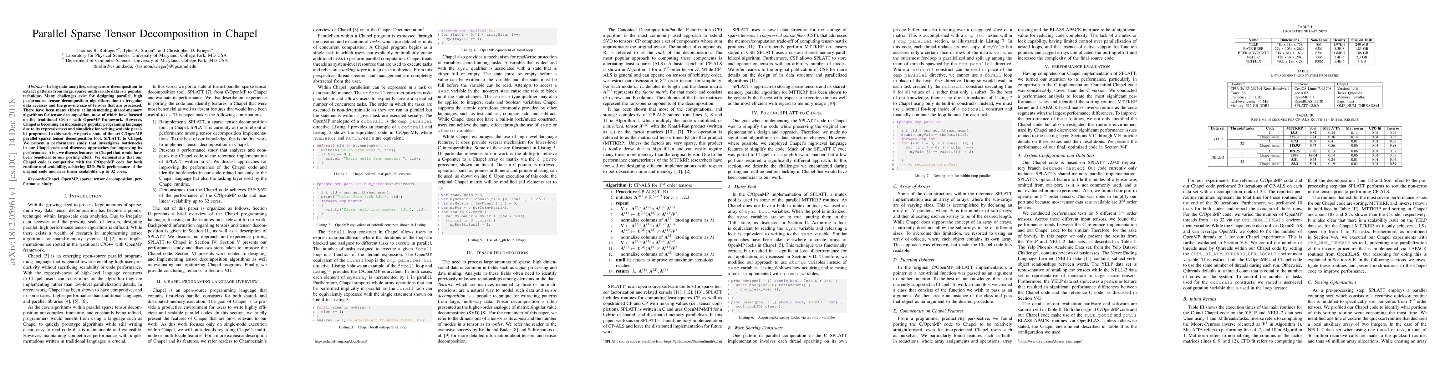 The development and optimization of SPLATT, which achieves high-performance results for sparse tensor computations using Chapel's parallel programming model.
