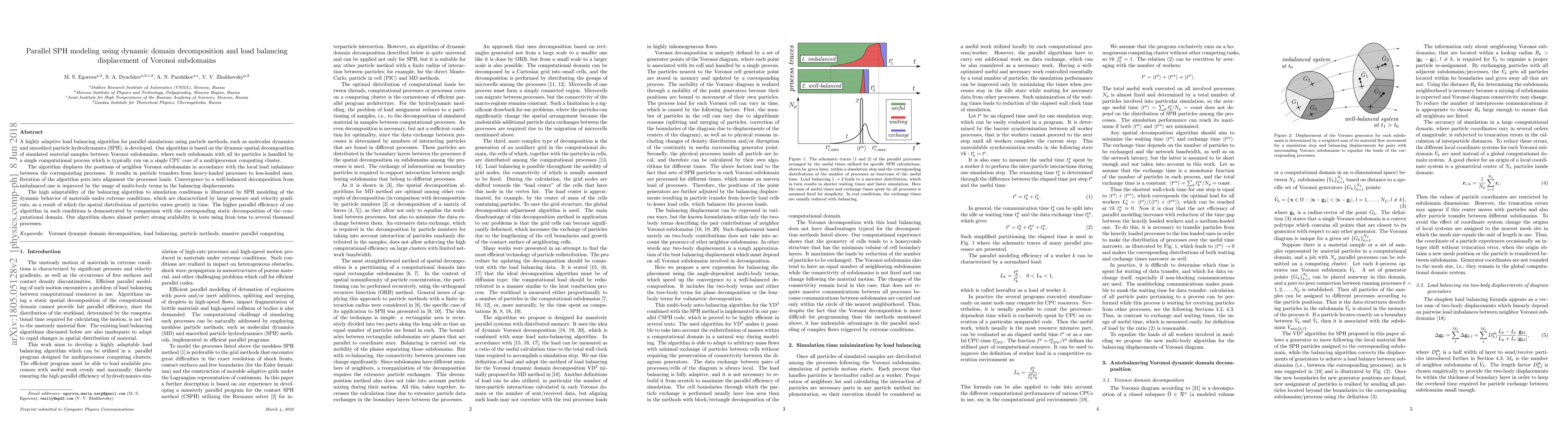 This paper presents a dynamic load balancing algorithm for parallel simulations using particle methods, specifically smoothed particle hydrodynamics (SPH). It employs Voronoi subdomains and adaptive displacement to balance computational loads across multiple processors, demonstrating high efficiency and scalability in modeling materials under extreme conditions.