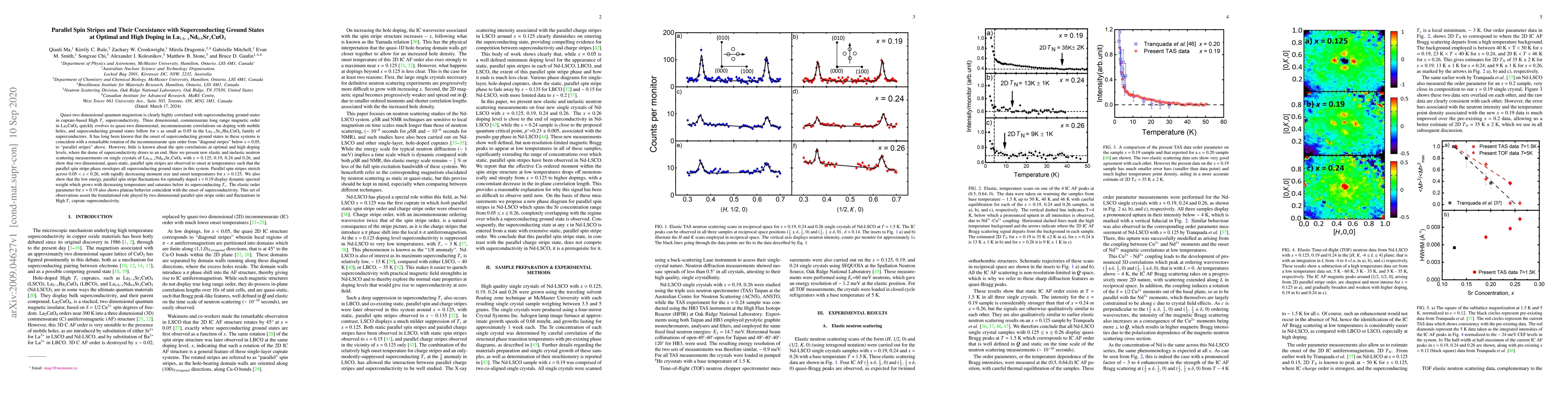 The research identifies the presence of two-dimensional, quasi-static, parallel spin stripes in La$_{1.6-x}$Nd$_{0.4}$Sr$_x$CuO$_4$ at optimal and high doping levels, where superconductivity ends. These stripes envelop superconducting ground states, with moment size and onset temperatures decreasing for higher doping. Dynamic spectral weight growth of low-energy, parallel spin stripe fluctuations is observed at optimal doping, supporting the fundamental role of two-dimensional parallel spin stripe order and fluctuations in High T$_c$ cuprate superconductivity.