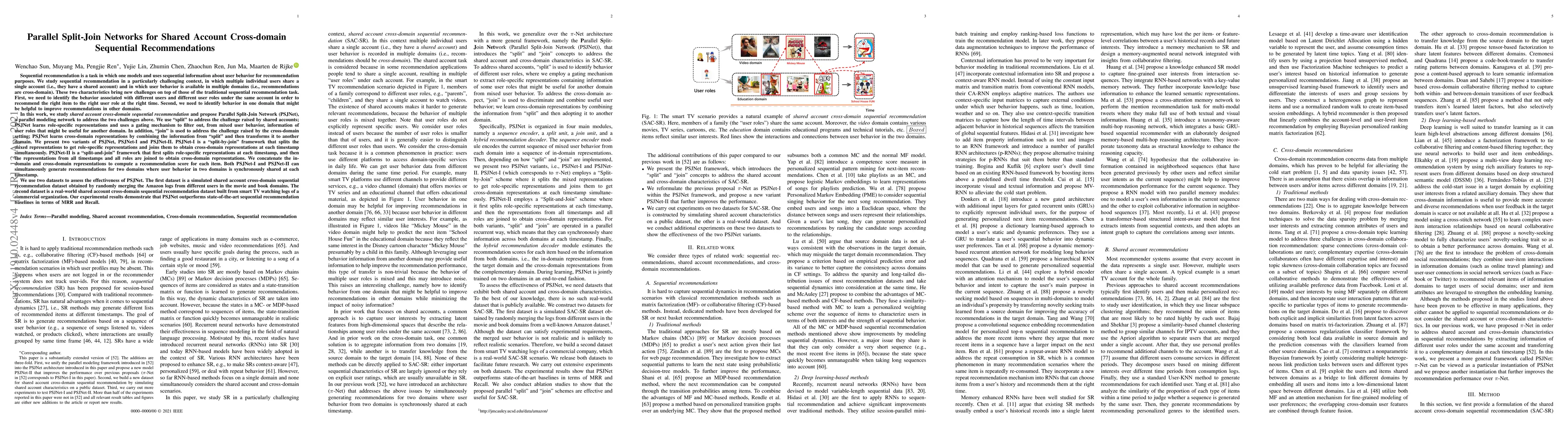 This paper proposes Parallel Split-Join Networks (PSJNet) to address sequential recommendation challenges in shared-account cross-domain scenarios. PSJNet models role-specific and cross-domain behaviors, outperforming state-of-the-art methods in terms of MRR and Recall.