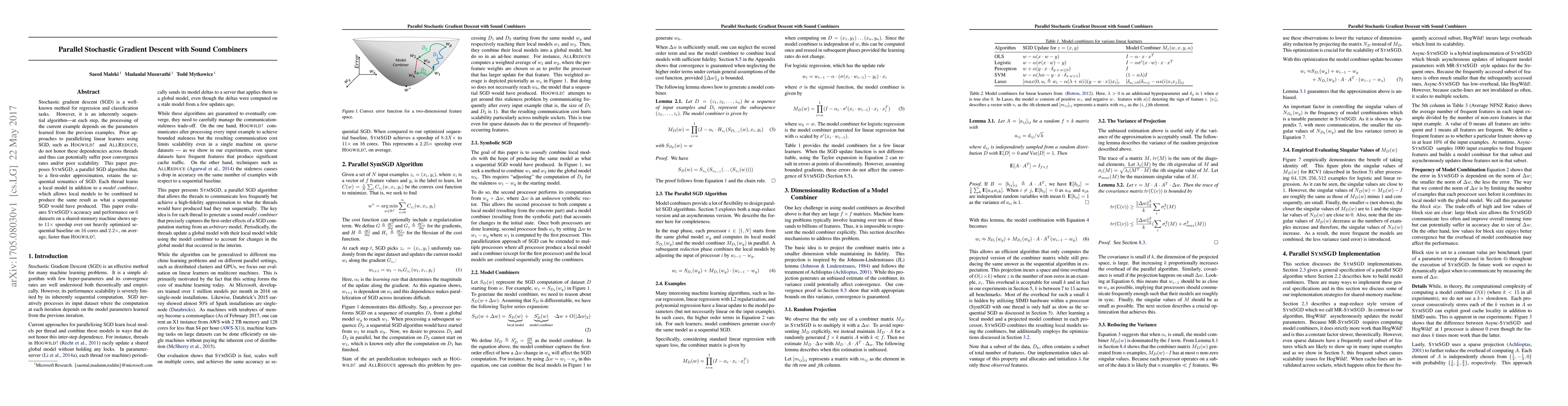 Stochastic gradient descent (SGD) is a well known method for regression and classification tasks. However, it is an inherently sequential algorithm at each step, the processing of the current example depends on the parameters learned from the previous examples. Prior approaches to parallelizing linear learners using SGD, such as HOGWILD! and ALLREDUCE, do not honor these dependencies across threads and thus can potentially suffer poor convergence rates and/or poor scalability. This paper proposes SYMSGD, a parallel SGD algorithm that, to a first-order approximation, retains the sequential semantics of SGD. Each thread learns a local model in addition to a model combiner, which allows local models to be combined to produce the same result as what a sequential SGD would have produced. This paper evaluates SYMSGD's accuracy and performance on 6 datasets on a shared-memory machine shows upto 11x speedup over our heavily optimized sequential baseline on 16 cores and 2.2x, on average, faster than HOGWILD!.
