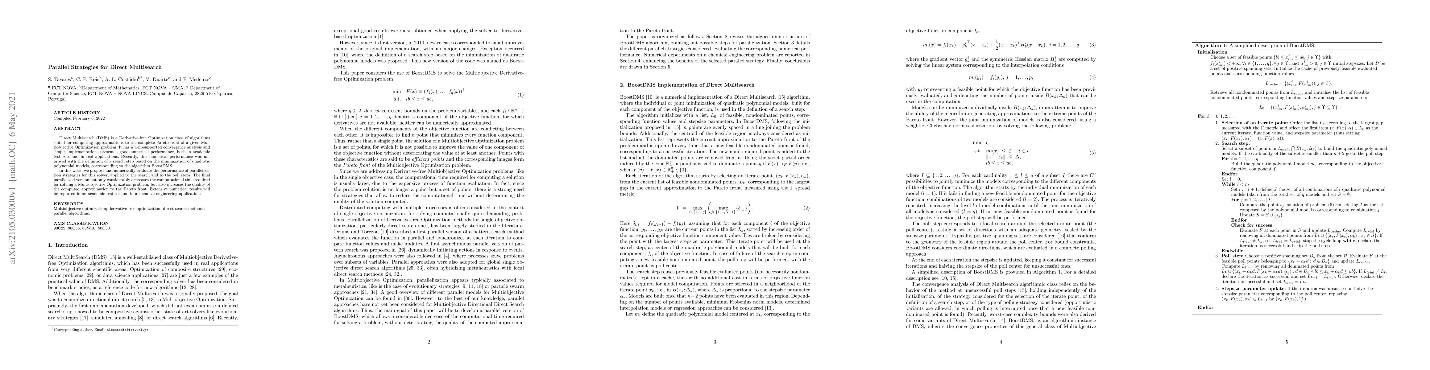Direct Multisearch (DMS) is a Derivative-free Optimization class of algorithms suited for computing approximations to the complete Pareto front of a given Multiobjective Optimization problem. It has a well-supported convergence analysis and simple implementations present a good numerical performance, both in academic test sets and in real applications. Recently, this numerical performance was improved with the definition of a search step based on the minimization of quadratic polynomial models, corresponding to the algorithm BoostDMS. In this work, we propose and numerically evaluate the performance of parallelization strategies for this solver, applied to the search and to the poll steps. The final parallelized version not only considerably decreases the computational time required for solving a Multiobjective Optimization problem, but also increases the quality of the computed approximation to the Pareto front. Extensive numerical results will be reported in an academic test set and in a chemical engineering application.