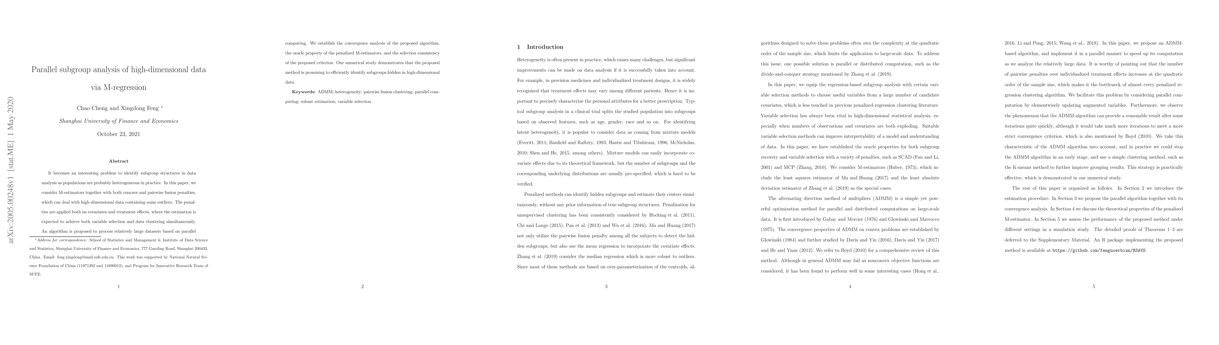 It becomes an interesting problem to identify subgroup structures in data analysis as populations are probably heterogeneous in practice. In this paper, we consider M-estimators together with both concave and pairwise fusion penalties, which can deal with high-dimensional data containing some outliers. The penalties are applied both on covariates and treatment effects, where the estimation is expected to achieve both variable selection and data clustering simultaneously. An algorithm is proposed to process relatively large datasets based on parallel computing. We establish the convergence analysis of the proposed algorithm, the oracle property of the penalized M-estimators, and the selection consistency of the proposed criterion. Our numerical study demonstrates that the proposed method is promising to efficiently identify subgroups hidden in high-dimensional data.