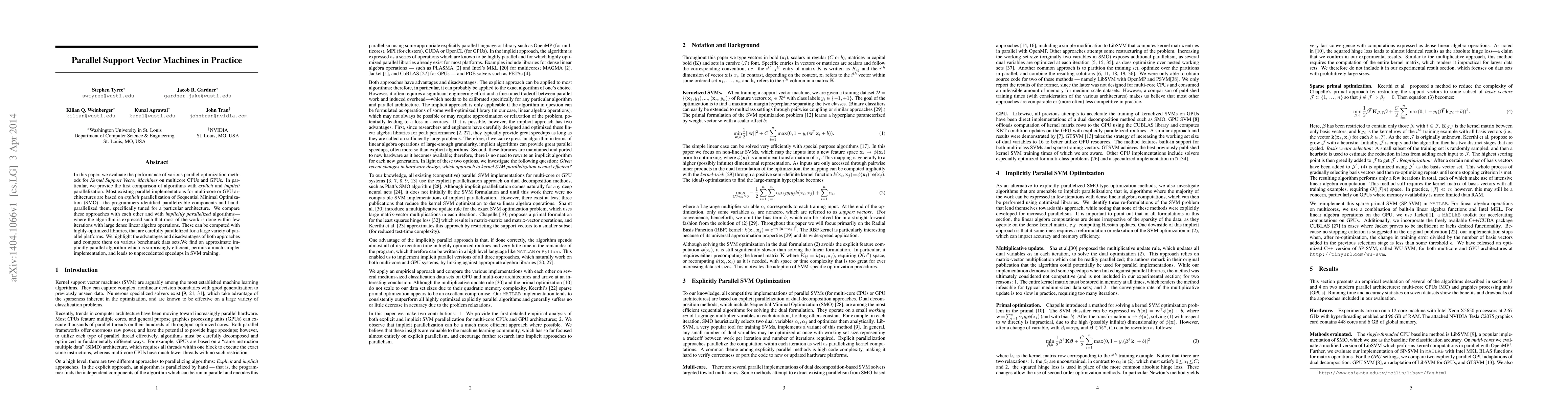 This paper compares explicit and implicit parallelization methods for parallel Support Vector Machines on multicore CPUs and GPUs, finding that implicitly parallel algorithms achieve significant speedups with simpler implementations. The study highlights the trade-offs between these methods and their performance on benchmark datasets.