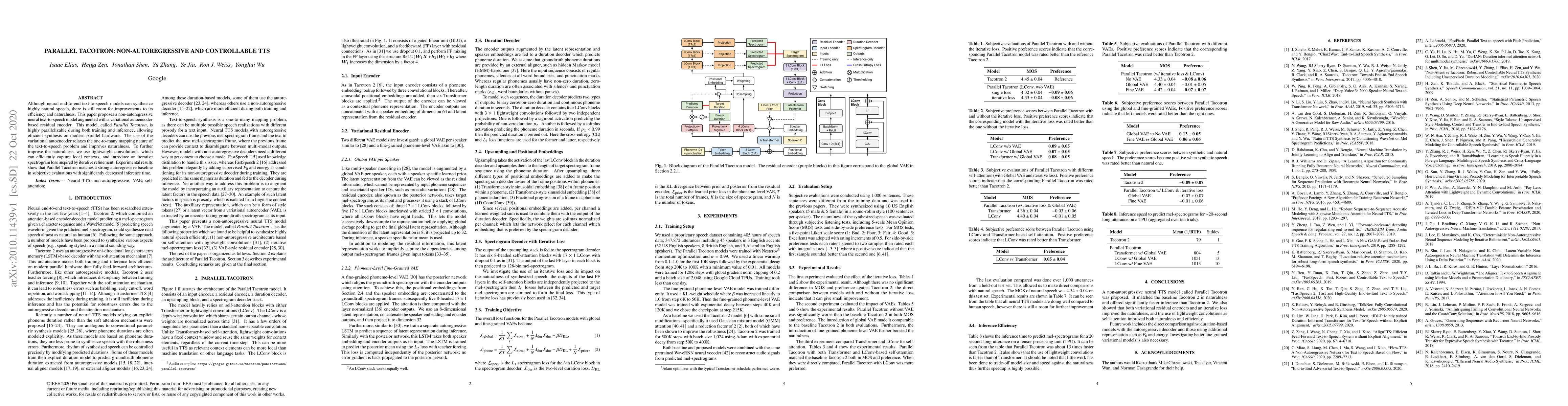 This paper introduces Parallel Tacotron, a non-autoregressive text-to-speech model that enhances efficiency and naturalness through a variational autoencoder-based residual encoder and lightweight convolutions. Experimental results show it matches autoregressive models in quality while significantly reducing inference time.