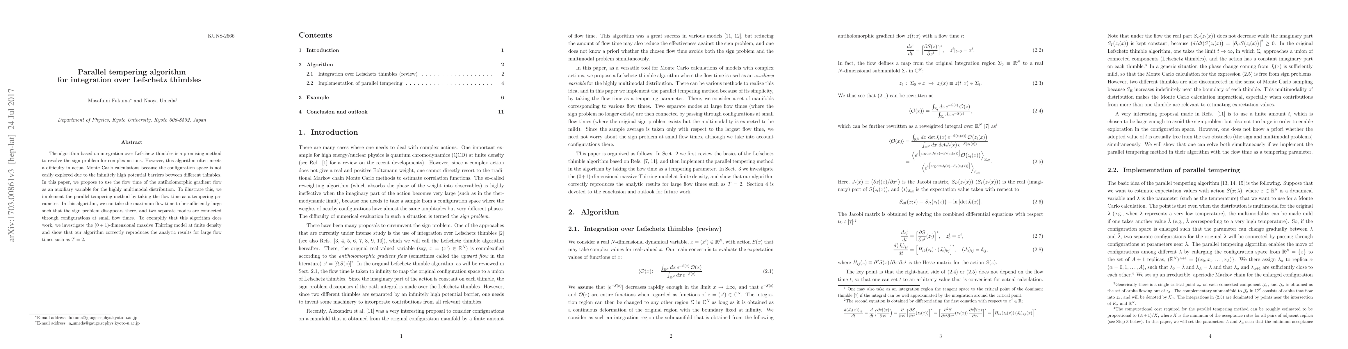 This paper proposes a parallel tempering algorithm to address the sign problem in integration over Lefschetz thimbles by using the flow time of the antiholomorphic gradient flow as a tempering parameter, successfully demonstrating its effectiveness in the (0+1)-dimensional massive Thirring model.