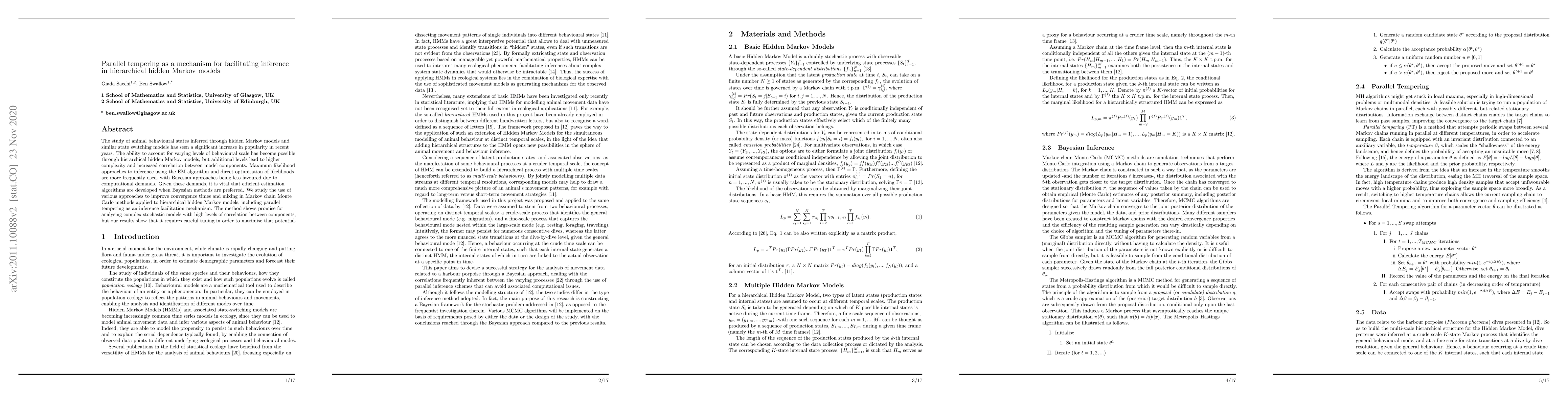 The study of animal behavioural states inferred through hidden Markov models and similar state switching models has seen a significant increase in popularity in recent years. The ability to account for varying levels of behavioural scale has become possible through hierarchical hidden Markov models, but additional levels lead to higher complexity and increased correlation between model components. Maximum likelihood approaches to inference using the EM algorithm and direct optimisation of likelihoods are more frequently used, with Bayesian approaches being less favoured due to computational demands. Given these demands, it is vital that efficient estimation algorithms are developed when Bayesian methods are preferred. We study the use of various approaches to improve convergence times and mixing in Markov chain Monte Carlo methods applied to hierarchical hidden Markov models, including parallel tempering as an inference facilitation mechanism. The method shows promise for analysing complex stochastic models with high levels of correlation between components, but our results show that it requires careful tuning in order to maximise that potential.