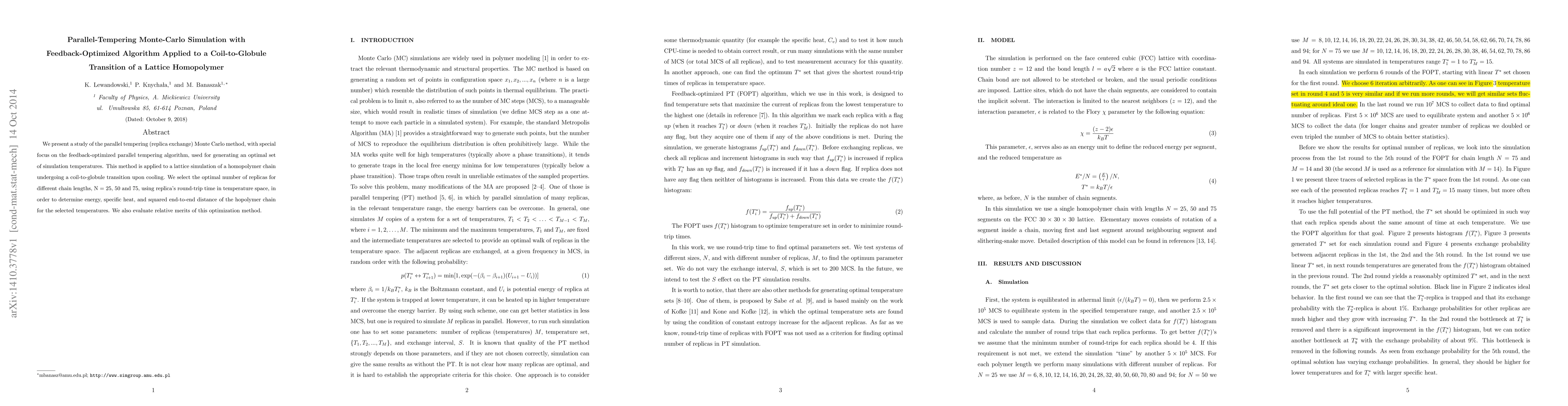 This paper investigates the parallel tempering Monte Carlo method, specifically the feedback-optimized parallel tempering algorithm, to simulate a lattice homopolymer's coil-to-globule transition. The study determines optimal replica numbers and temperatures for different chain lengths to analyze energy, specific heat, and end-to-end distance.