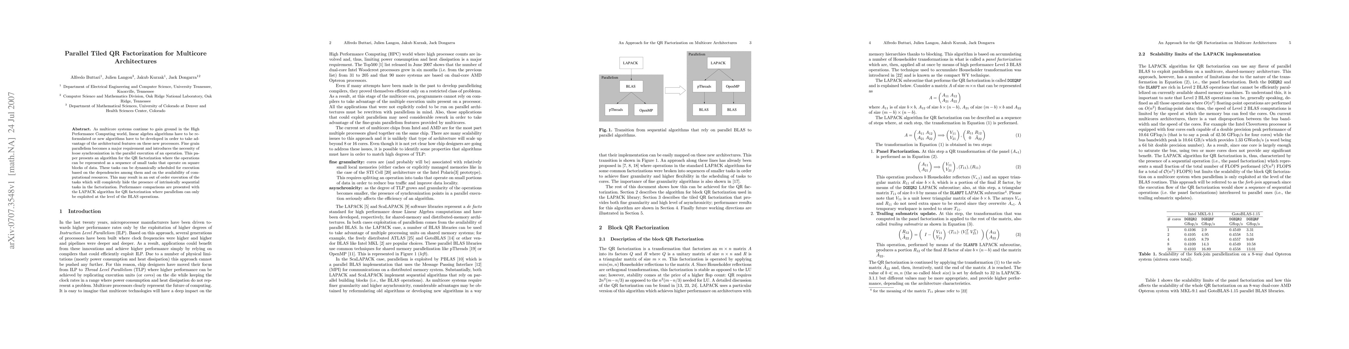 This paper introduces a parallel tiled QR factorization algorithm designed for multicore systems, enabling fine-grain parallelism and loose synchronization to optimize performance. It dynamically schedules small tasks based on data dependencies and resource availability, achieving better performance compared to the LAPACK algorithm.