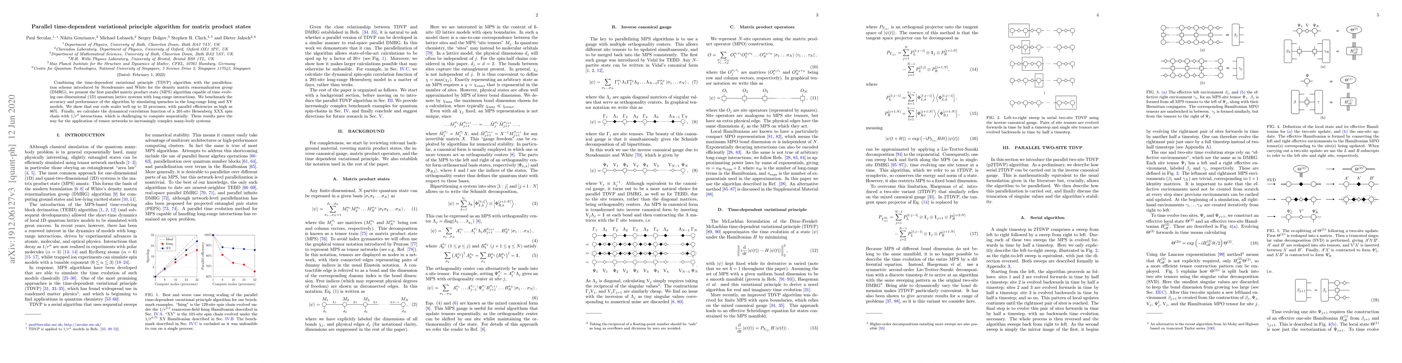 This paper introduces a parallel time-dependent variational principle (TDVP) algorithm for matrix product states (MPS), enabling efficient time evolution of 1D quantum systems with long-range interactions. The algorithm demonstrates high parallel efficiency and scalability, as evidenced by successful simulations of long-range Ising and XY models and the computation of a challenging dynamical correlation function for a 201-site Heisenberg XXX spin chain.