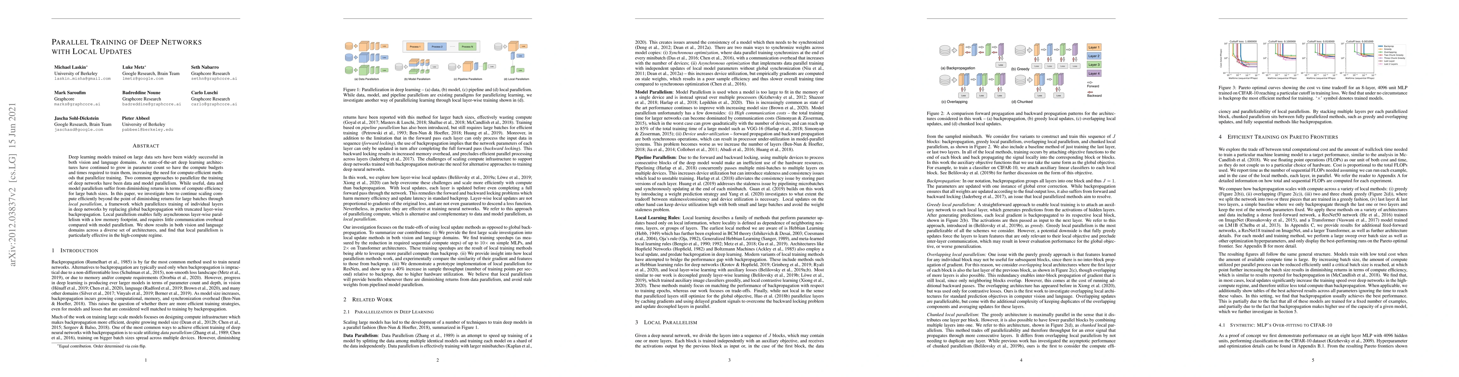 Deep learning models trained on large data sets have been widely successful in both vision and language domains. As state-of-the-art deep learning architectures have continued to grow in parameter count so have the compute budgets and times required to train them, increasing the need for compute-efficient methods that parallelize training. Two common approaches to parallelize the training of deep networks have been data and model parallelism. While useful, data and model parallelism suffer from diminishing returns in terms of compute efficiency for large batch sizes. In this paper, we investigate how to continue scaling compute efficiently beyond the point of diminishing returns for large batches through local parallelism, a framework which parallelizes training of individual layers in deep networks by replacing global backpropagation with truncated layer-wise backpropagation. Local parallelism enables fully asynchronous layer-wise parallelism with a low memory footprint, and requires little communication overhead compared with model parallelism. We show results in both vision and language domains across a diverse set of architectures, and find that local parallelism is particularly effective in the high-compute regime.
