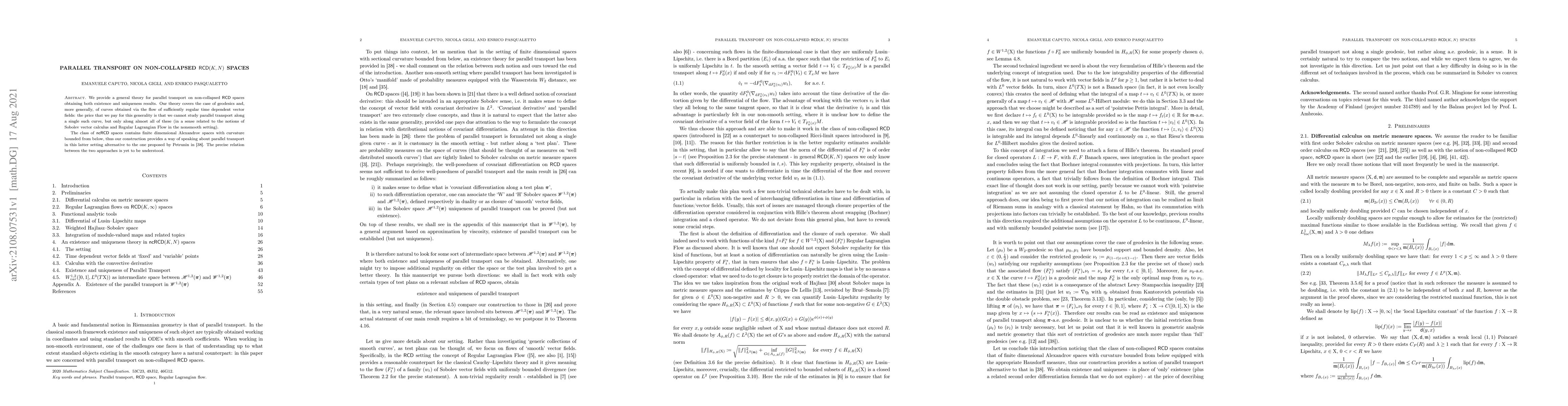 We provide a general theory for parallel transport on non-collapsed ${\sf RCD}$ spaces obtaining both existence and uniqueness results. Our theory covers the case of geodesics and, more generally, of curves obtained via the flow of sufficiently regular time dependent vector fields: the price that we pay for this generality is that we cannot study parallel transport along a single such curve, but only along almost all of these (in a sense related to the notions of Sobolev vector calculus and Regular Lagrangian Flow in the nonsmooth setting). The class of ${\sf ncRCD}$ spaces contains finite dimensional Alexandrov spaces with curvature bounded from below, thus our construction provides a way of speaking about parallel transport in this latter setting alternative to the one proposed by Petrunin (1998). The precise relation between the two approaches is yet to be understood.