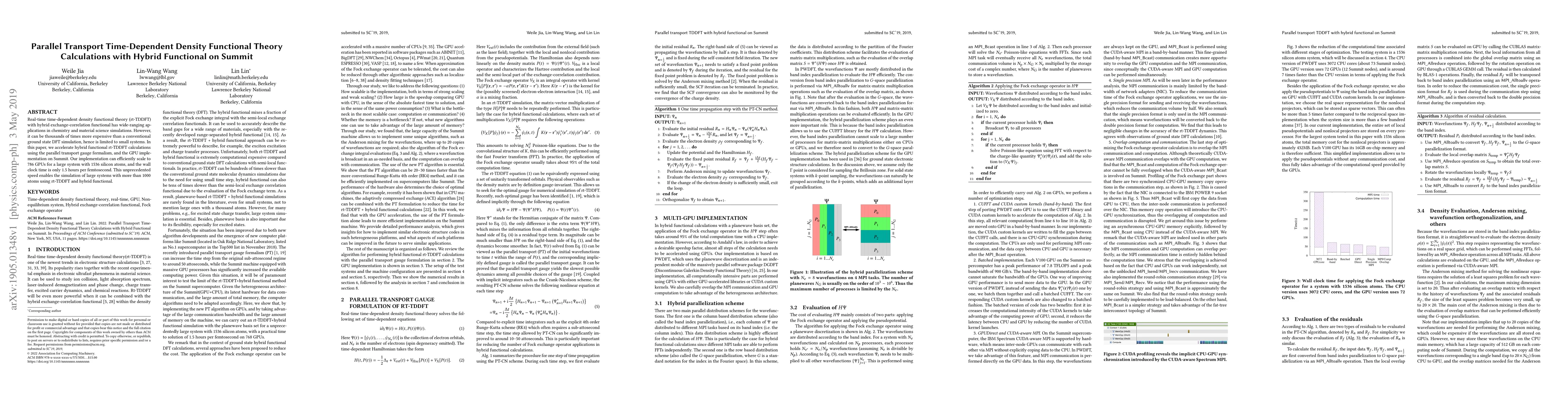 This paper presents an accelerated parallel transport gauge formalism for hybrid functional real-time time-dependent density functional theory (rt-TDDFT) calculations on the Summit supercomputer, enabling efficient scaling to 786 GPUs and reducing wall clock time to 1.5 hours per femtosecond for large systems with 1536 silicon atoms. This advancement allows for the simulation of large systems with over 1000 atoms using rt-TDDFT and hybrid functional.