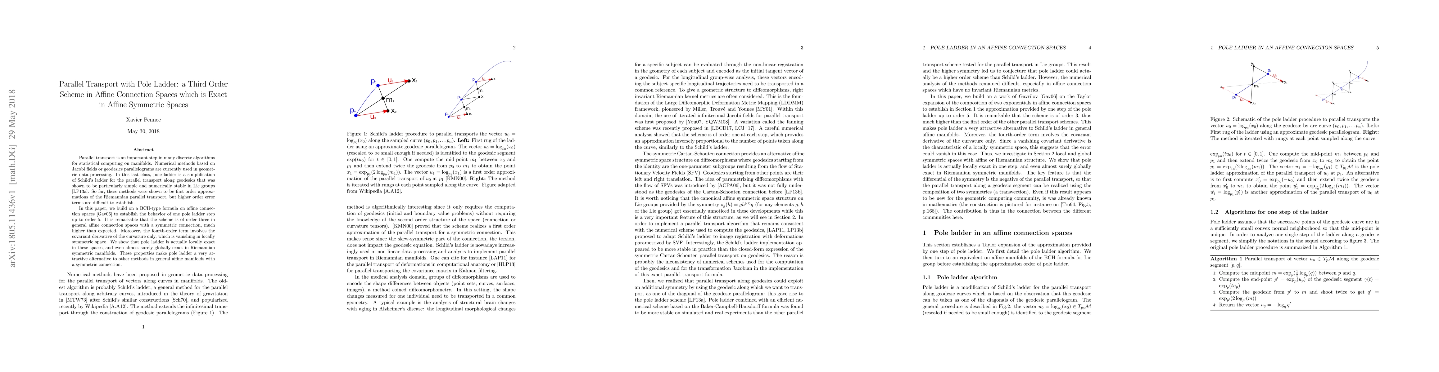 Parallel transport is an important step in many discrete algorithms for statistical computing on manifolds. Numerical methods based on Jacobi fields or geodesics parallelograms are currently used in geometric data processing. In this last class, pole ladder is a simplification of Schild's ladder for the parallel transport along geodesics that was shown to be particularly simple and numerically stable in Lie groups. So far, these methods were shown to be first order approximations of the Riemannian parallel transport, but higher order error terms are difficult to establish. In this paper, we build on a BCH-type formula on affine connection spaces to establish the behavior of one pole ladder step up to order 5. It is remarkable that the scheme is of order three in general affine connection spaces with a symmetric connection, much higher than expected. Moreover, the fourth-order term involves the covariant derivative of the curvature only, which is vanishing in locally symmetric space. We show that pole ladder is actually locally exact in these spaces, and even almost surely globally exact in Riemannian symmetric manifolds. These properties make pole ladder a very attractive alternative to other methods in general affine manifolds with a symmetric connection.