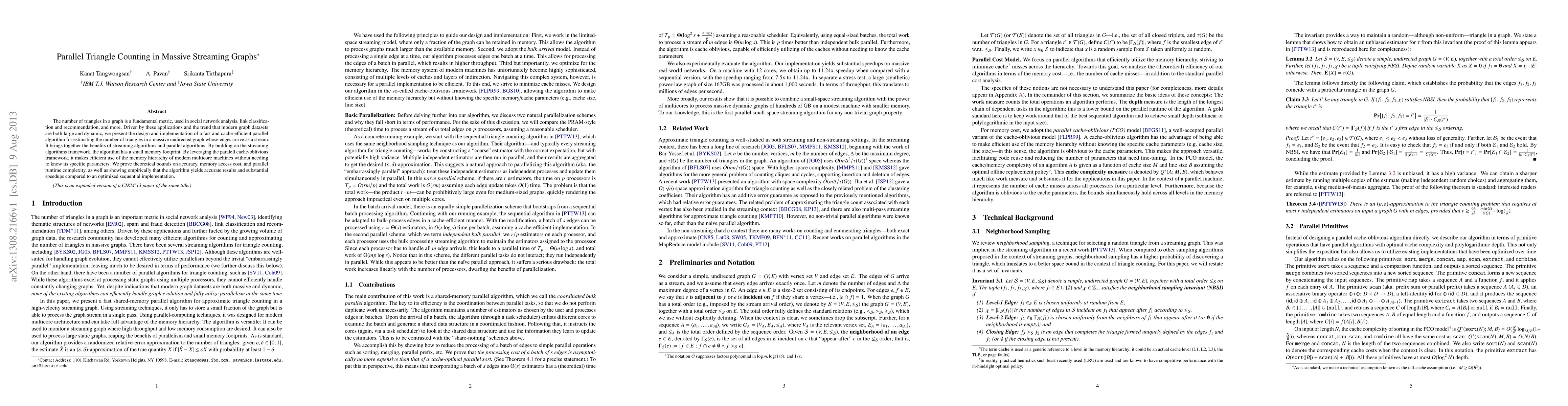 The number of triangles in a graph is a fundamental metric, used in social network analysis, link classification and recommendation, and more. Driven by these applications and the trend that modern graph datasets are both large and dynamic, we present the design and implementation of a fast and cache-efficient parallel algorithm for estimating the number of triangles in a massive undirected graph whose edges arrive as a stream. It brings together the benefits of streaming algorithms and parallel algorithms. By building on the streaming algorithms framework, the algorithm has a small memory footprint. By leveraging the paralell cache-oblivious framework, it makes efficient use of the memory hierarchy of modern multicore machines without needing to know its specific parameters. We prove theoretical bounds on accuracy, memory access cost, and parallel runtime complexity, as well as showing empirically that the algorithm yields accurate results and substantial speedups compared to an optimized sequential implementation. (This is an expanded version of a CIKM'13 paper of the same title.)