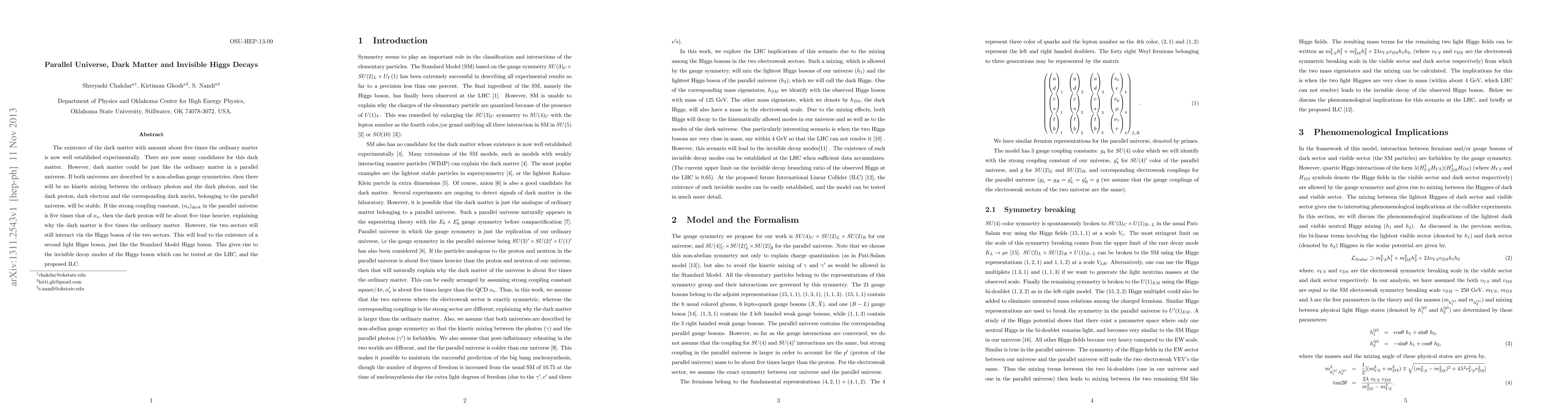 The existence of the dark matter with amount about five times the ordinary matter is now well established experimentally. There are now many candidates for this dark matter. However, dark matter could be just like the ordinary matter in a parallel universe. If both universes are described by a non-abelian gauge symmetries, then there will be no kinetic mixing between the ordinary photon and the dark photon, and the dark proton, dark electron and the corresponding dark nuclei, belonging to the parallel universe, will be stable. If the strong coupling constant, $(\alpha_s)_{dark}$ in the parallel universe is five times that of $\alpha_s$, then the dark proton will be about five time heavier, explaining why the dark matter is five times the ordinary matter. However, the two sectors will still interact via the Higgs boson of the two sectors. This will lead to the existence of a second light Higss boson, just like the Standard Model Higgs boson. This gives rise to the invisible decay modes of the Higgs boson which can be tested at the LHC, and the proposed ILC.