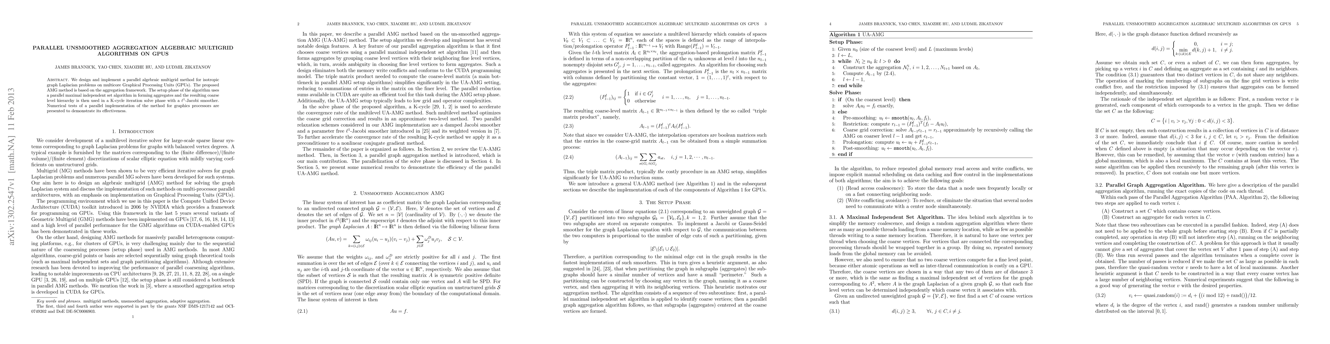 We design and implement a parallel algebraic multigrid method for isotropic graph Laplacian problems on multicore Graphical Processing Units (GPUs). The proposed AMG method is based on the aggregation framework. The setup phase of the algorithm uses a parallel maximal independent set algorithm in forming aggregates and the resulting coarse level hierarchy is then used in a K-cycle iteration solve phase with a $\ell^1$-Jacobi smoother. Numerical tests of a parallel implementation of the method for graphics processors are presented to demonstrate its effectiveness.