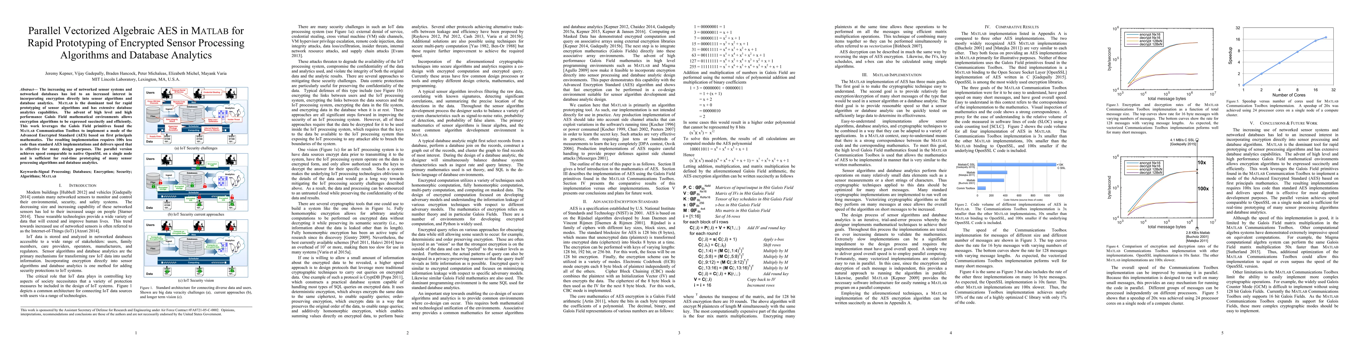 This paper presents a parallel vectorized AES implementation in MATLAB using Galois Field primitives for rapid prototyping of encrypted sensor algorithms and database analytics. The proposed method achieves 100x less code and comparable speed to native OpenSSL, suitable for real-time prototyping.