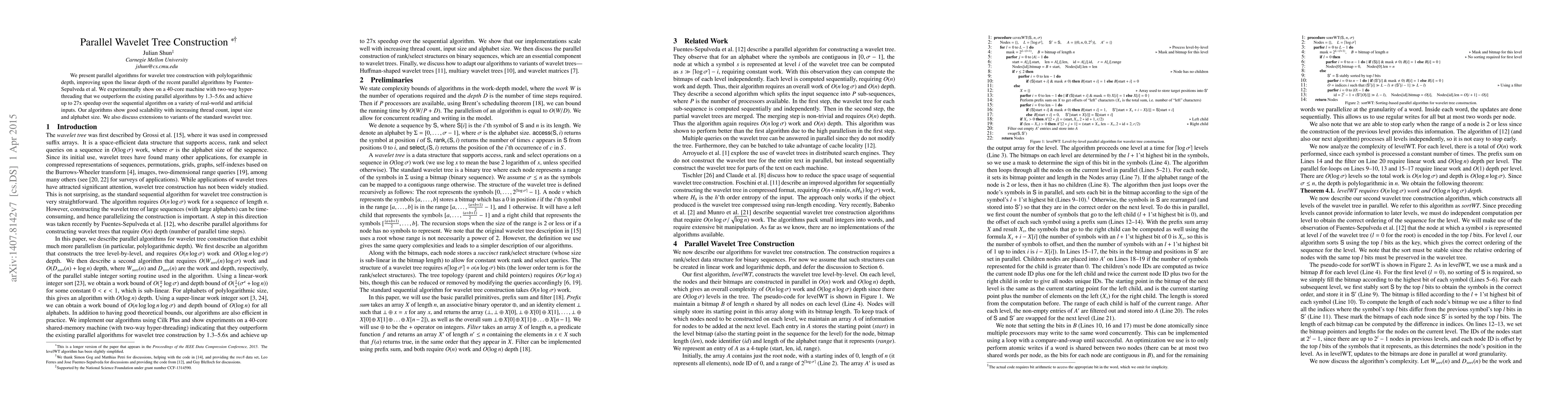 This paper introduces parallel algorithms for wavelet tree construction with significantly reduced depth, achieving up to 27x speedup over sequential methods on a 40-core machine, and demonstrating good scalability with increased thread count and input size.