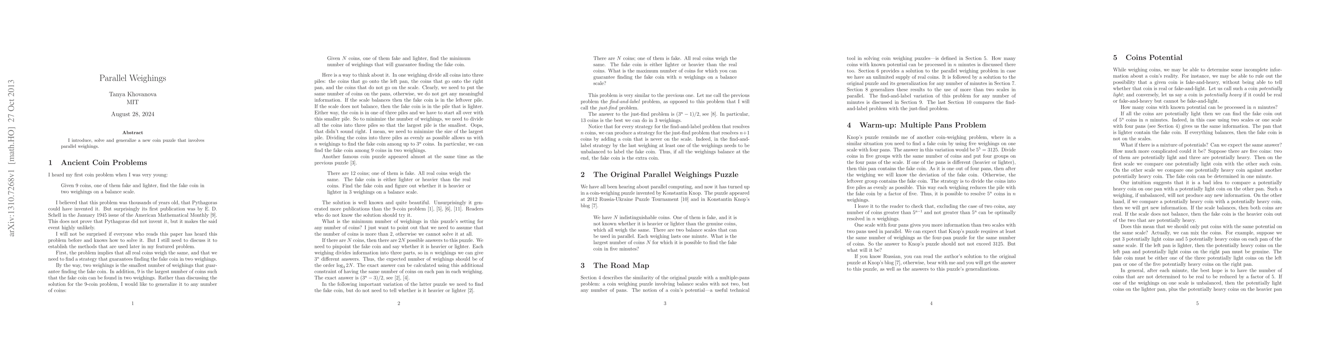 I introduce, solve and generalize a new coin puzzle that involves parallel weighings.
