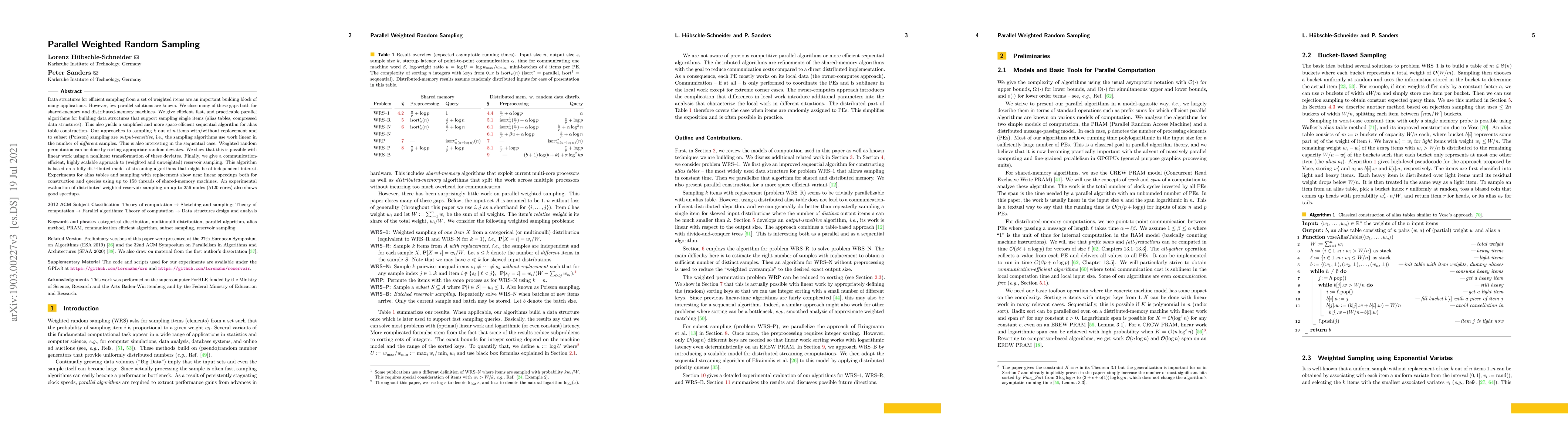This paper proposes parallel algorithms for efficient weighted random sampling, addressing both shared-memory and distributed-memory architectures. The authors introduce scalable methods for constructing sampling data structures and achieve linear work complexity in sampling, demonstrating near-linear speedups in experiments across multiple threads and nodes.