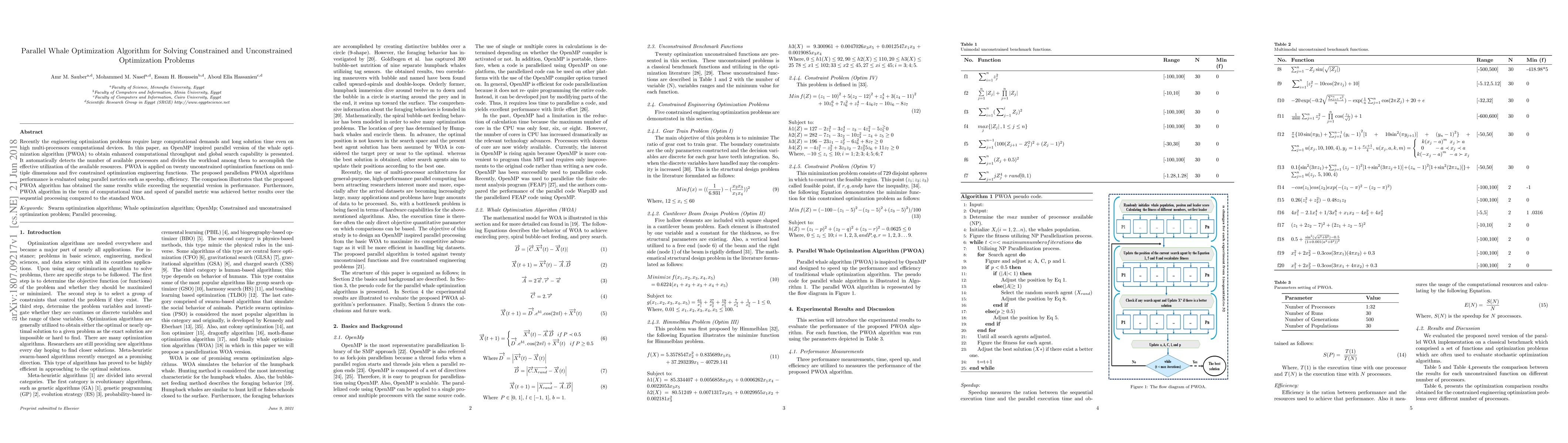This paper introduces a parallel version of the Whale Optimization Algorithm (PWOA) utilizing OpenMP for enhanced computational throughput and global search capability. The PWOA algorithm is evaluated on both unconstrained and constrained optimization problems, demonstrating superior performance in terms of computational time and parallel metrics compared to its sequential counterpart.