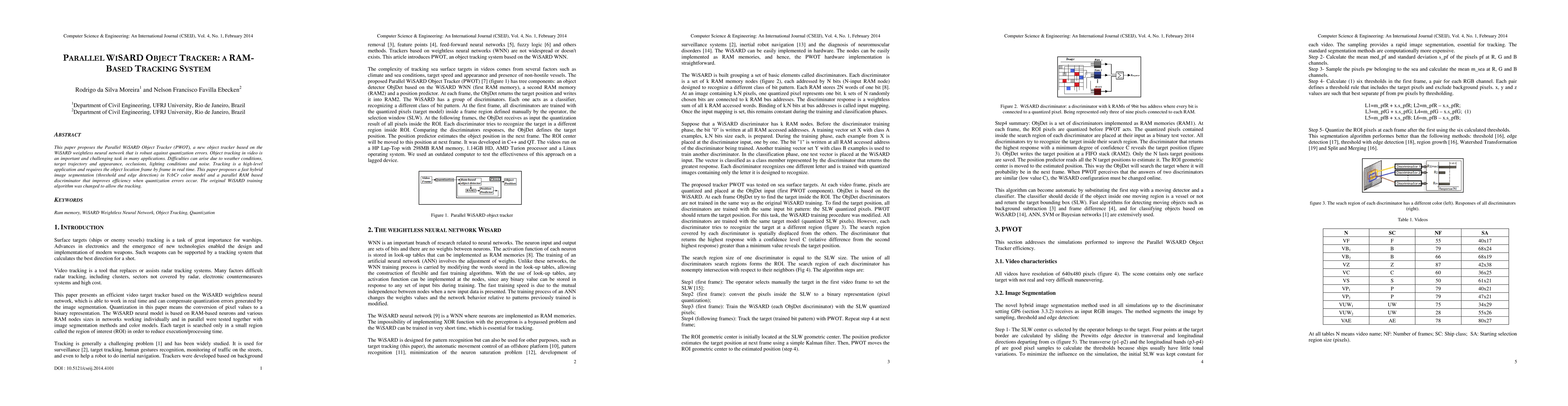 This paper proposes the Parallel WiSARD Object Tracker (PWOT), a new object tracker based on the WiSARD weightless neural network that is robust against quantization errors. Object tracking in video is an important and challenging task in many applications. Difficulties can arise due to weather conditions, target trajectory and appearance, occlusions, lighting conditions and noise. Tracking is a high-level application and requires the object location frame by frame in real time. This paper proposes a fast hybrid image segmentation (threshold and edge detection) in YcbCr color model and a parallel RAM based discriminator that improves efficiency when quantization errors occur. The original WiSARD training algorithm was changed to allow the tracking.