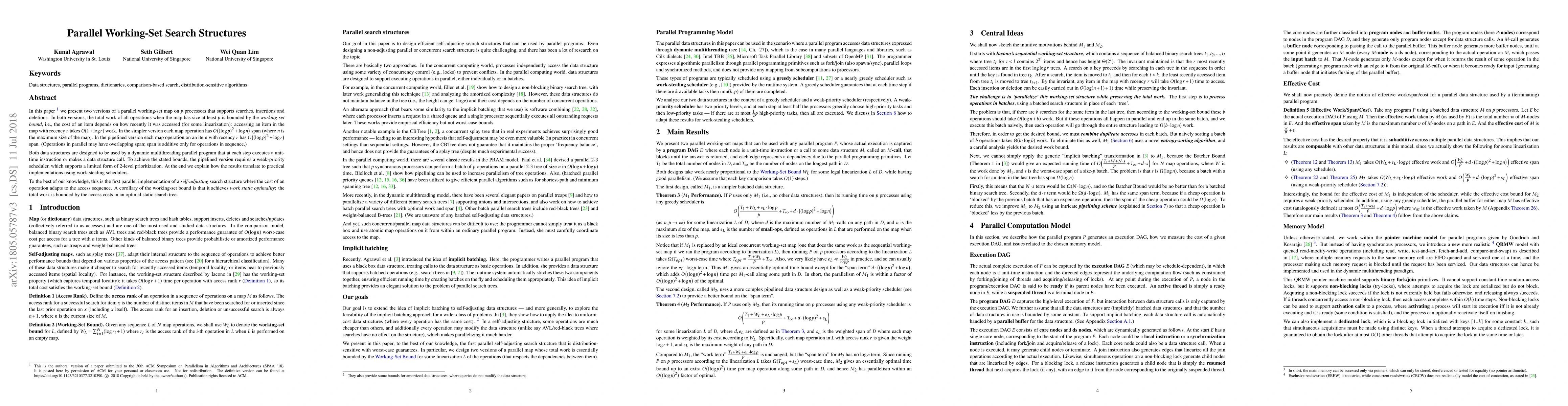 In this paper we present two versions of a parallel working-set map on p processors that supports searches, insertions and deletions. In both versions, the total work of all operations when the map has size at least p is bounded by the working-set bound, i.e., the cost of an item depends on how recently it was accessed (for some linearization): accessing an item in the map with recency r takes O(1+log r) work. In the simpler version each map operation has O((log p)^2+log n) span (where n is the maximum size of the map). In the pipelined version each map operation on an item with recency r has O((log p)^2+log r) span. (Operations in parallel may have overlapping span; span is additive only for operations in sequence.) Both data structures are designed to be used by a dynamic multithreading parallel program that at each step executes a unit-time instruction or makes a data structure call. To achieve the stated bounds, the pipelined data structure requires a weak-priority scheduler, which supports a limited form of 2-level prioritization. At the end we explain how the results translate to practical implementations using work-stealing schedulers. To the best of our knowledge, this is the first parallel implementation of a self-adjusting search structure where the cost of an operation adapts to the access sequence. A corollary of the working-set bound is that it achieves work static optimality: the total work is bounded by the access costs in an optimal static search tree.