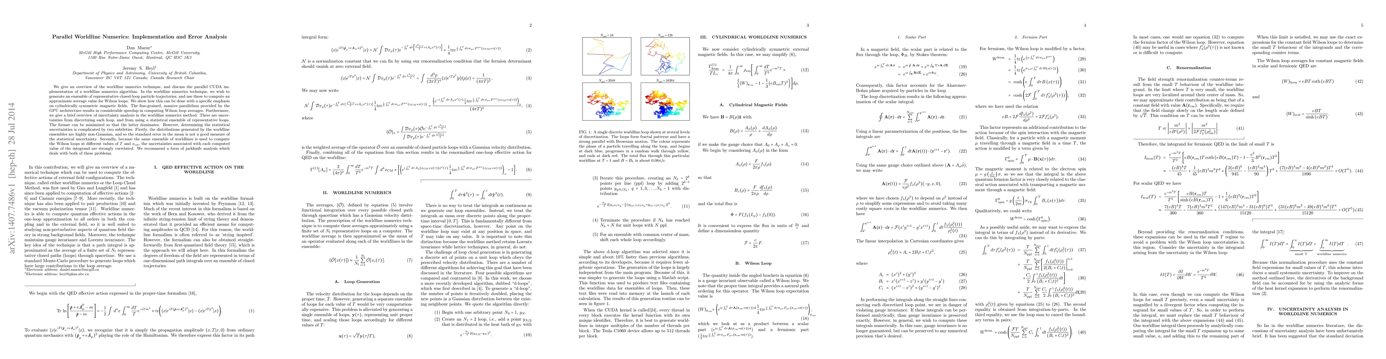 We give an overview of the worldline numerics technique, and discuss the parallel CUDA implementation of a worldline numerics algorithm. In the worldline numerics technique, we wish to generate an ensemble of representative closed-loop particle trajectories, and use these to compute an approximate average value for Wilson loops. We show how this can be done with a specific emphasis on cylindrically symmetric magnetic fields. The fine-grained, massive parallelism provided by the GPU architecture results in considerable speedup in computing Wilson loop averages. Furthermore, we give a brief overview of uncertainty analysis in the worldline numerics method. There are uncertainties from discretizing each loop, and from using a statistical ensemble of representative loops. The former can be minimized so that the latter dominates. However, determining the statistical uncertainties is complicated by two subtleties. Firstly, the distributions generated by the worldline ensembles are highly non-Gaussian, and so the standard error in the mean is not a good measure of the statistical uncertainty. Secondly, because the same ensemble of worldlines is used to compute the Wilson loops at different values of $T$ and $x_\mathrm{ cm}$, the uncertainties associated with each computed value of the integrand are strongly correlated. We recommend a form of jackknife analysis which deals with both of these problems.