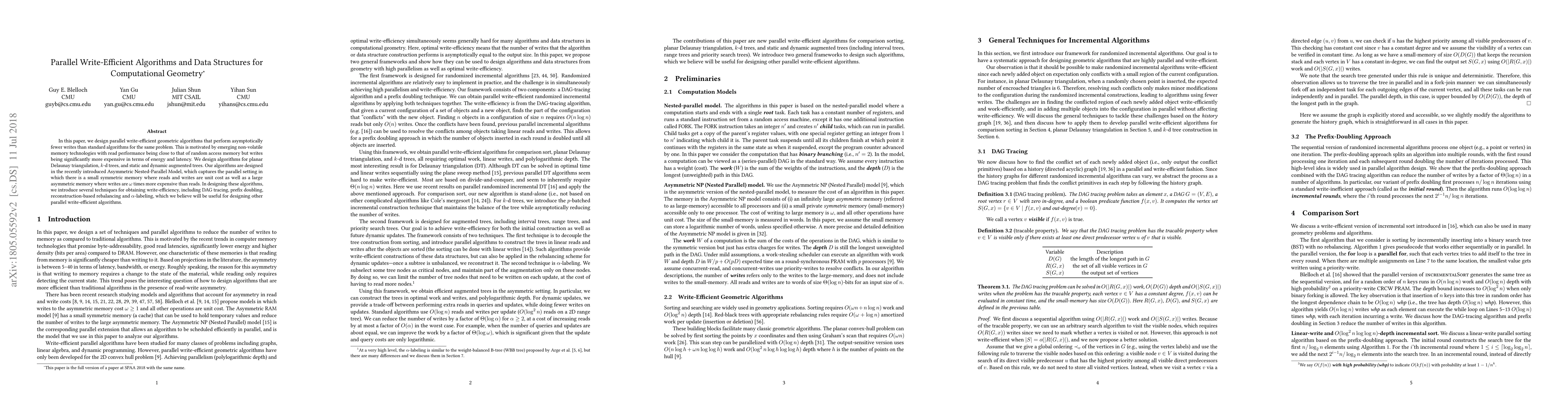 This paper presents parallel write-efficient algorithms for computational geometry tasks, including Delaunay triangulation and $k$-d trees, designed to minimize writes in the Asymmetric Nested-Parallel Model. The authors introduce techniques like DAG tracing and prefix doubling to achieve write-efficiency, motivated by the cost disparity between reads and writes in emerging non-volatile memory technologies.