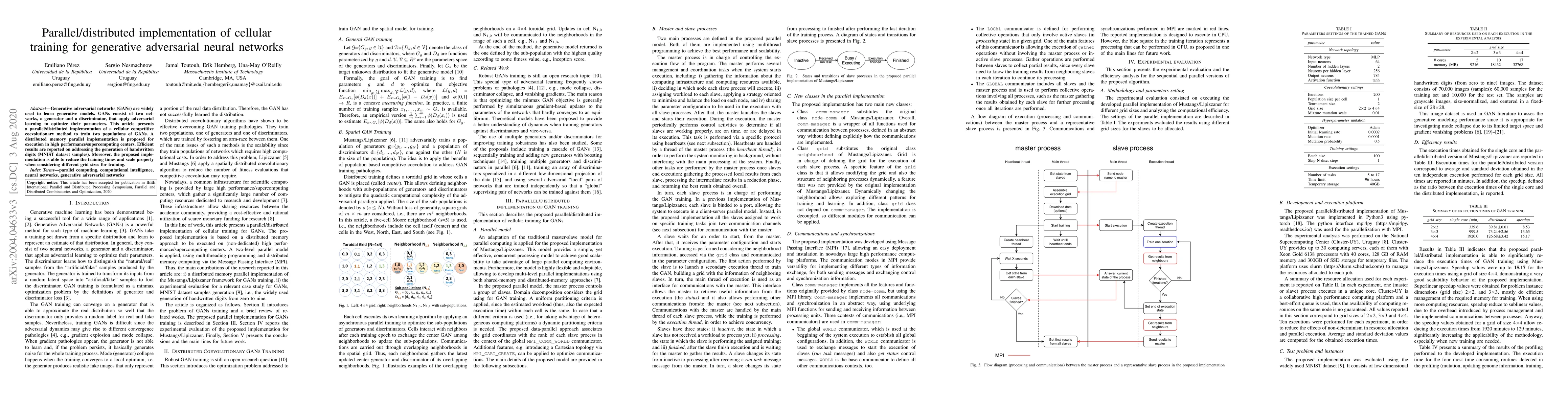 This paper proposes a parallel/distributed implementation of cellular training for GANs, utilizing a competitive coevolutionary method to train two populations. The distributed memory parallel approach significantly reduces training times and scales effectively across different grid sizes, demonstrating efficient results on the MNIST dataset.