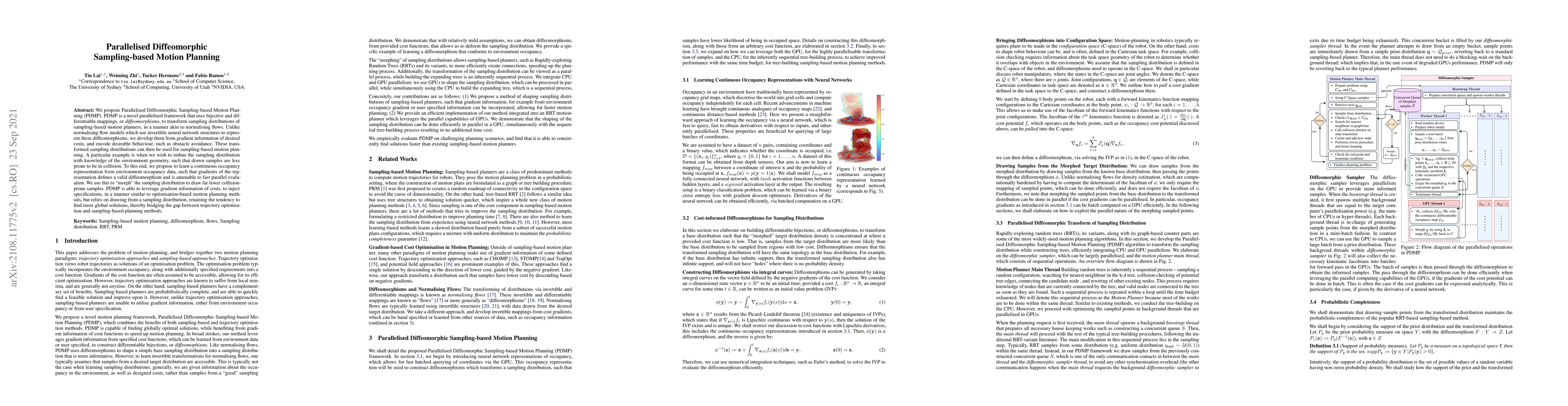 We propose Parallelised Diffeomorphic Sampling-based Motion Planning (PDMP). PDMP is a novel parallelised framework that uses bijective and differentiable mappings, or diffeomorphisms, to transform sampling distributions of sampling-based motion planners, in a manner akin to normalising flows. Unlike normalising flow models which use invertible neural network structures to represent these diffeomorphisms, we develop them from gradient information of desired costs, and encode desirable behaviour, such as obstacle avoidance. These transformed sampling distributions can then be used for sampling-based motion planning. A particular example is when we wish to imbue the sampling distribution with knowledge of the environment geometry, such that drawn samples are less prone to be in collisions. To this end, we propose to learn a continuous occupancy representation from environment occupancy data, such that gradients of the representation defines a valid diffeomorphism and is amenable to fast parallel evaluation. We use this to "morph" the sampling distribution to draw far fewer collision-prone samples. PDMP is able to leverage gradient information of costs, to inject specifications, in a manner similar to optimisation-based motion planning methods, but relies on drawing from a sampling distribution, retaining the tendency to find more global solutions, thereby bridging the gap between trajectory optimisation and sampling-based planning methods.