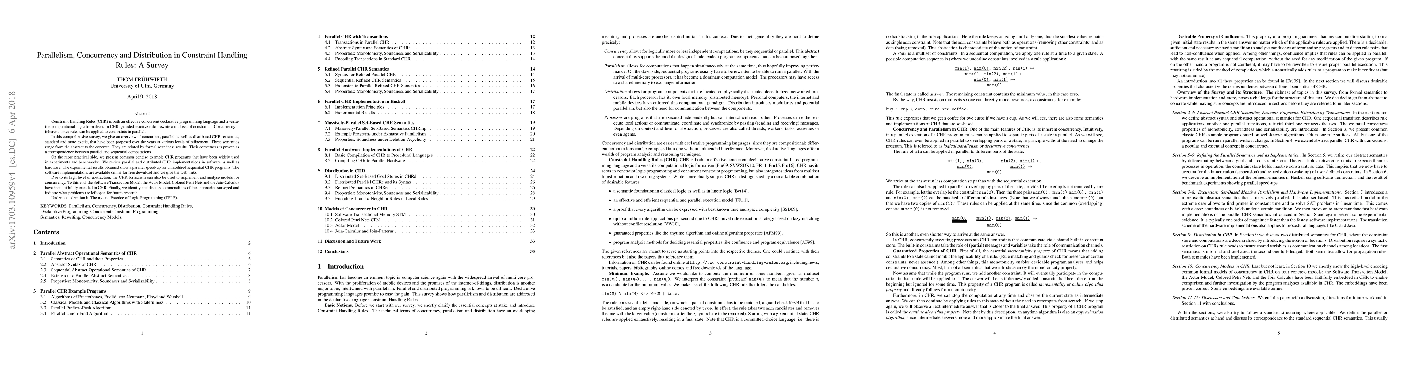 Constraint Handling Rules is an effective concurrent declarative programming language and a versatile computational logic formalism. CHR programs consist of guarded reactive rules that transform multisets of constraints. One of the main features of CHR is its inherent concurrency. Intuitively, rules can be applied to parts of a multiset in parallel. In this comprehensive survey, we give an overview of concurrent and parallel as well as distributed CHR semantics, standard and more exotic, that have been proposed over the years at various levels of refinement. These semantics range from the abstract to the concrete. They are related by formal soundness results. Their correctness is established as correspondence between parallel and sequential computations. We present common concise sample CHR programs that have been widely used in experiments and benchmarks. We review parallel CHR implementations in software and hardware. The experimental results obtained show a consistent parallel speedup. Most implementations are available online. The CHR formalism can also be used to implement and reason with models for concurrency. To this end, the Software Transaction Model, the Actor Model, Colored Petri Nets and the Join-Calculus have been faithfully encoded in CHR. Under consideration in Theory and Practice of Logic Programming (TPLP).