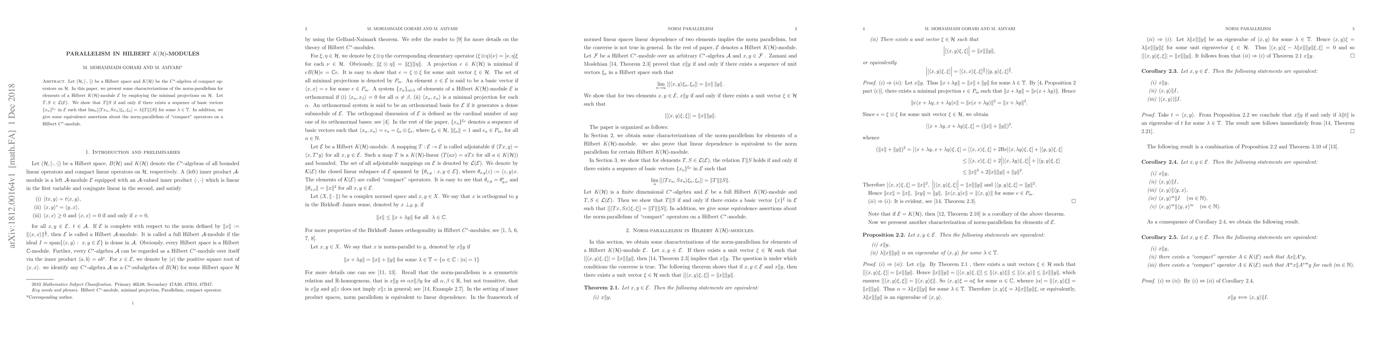 This paper characterizes norm-parallelism in Hilbert $K(\mathcal{H})$-modules using minimal projections on $\mathcal{H}$, showing that $T \| S$ if and only if a specific limit condition involving basic vectors in $\mathcal{E}$ holds. It also provides equivalences for norm-parallelism of compact operators on Hilbert $C^*$-modules.