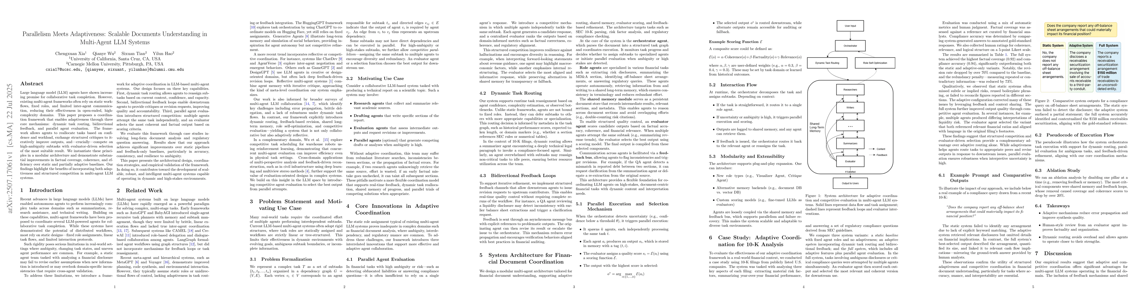 The research proposes a coordination framework for multi-agent LLM systems that introduces dynamic task routing, bidirectional feedback, and parallel agent evaluation to enhance adaptiveness and efficiency in complex domains like financial document analysis.