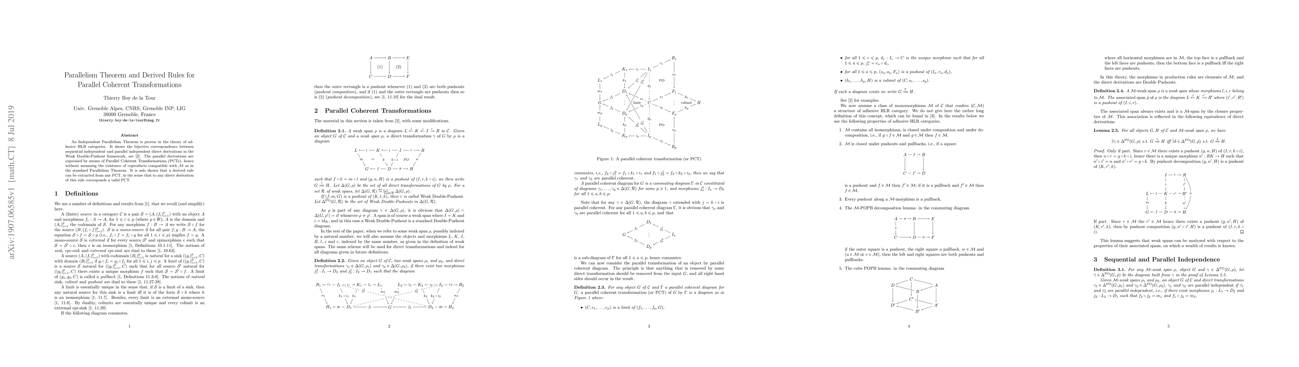 A new theorem proves the bijective correspondence between sequential and parallel independent derivations in a Weak Double-Pushout framework, allowing for parallel transformations without assuming coproducts. This enables the extraction of derived rules from Parallel Coherent Transformations.