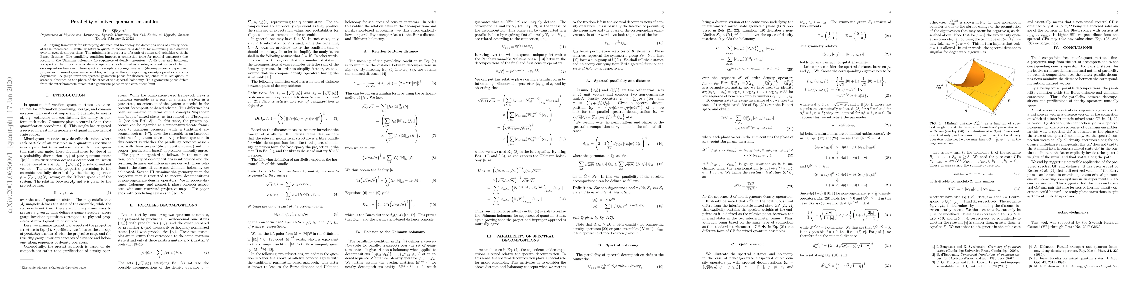 This paper introduces a framework for identifying distance and holonomy in mixed quantum ensembles, defining parallelity through the minimization of the Bures distance. The study reveals a connection that leads to the Uhlmann holonomy for sequences of density operators, and identifies spectral decompositions as gauge invariant properties, yielding a distinct geometric phase for discrete sequences of mixed quantum states.