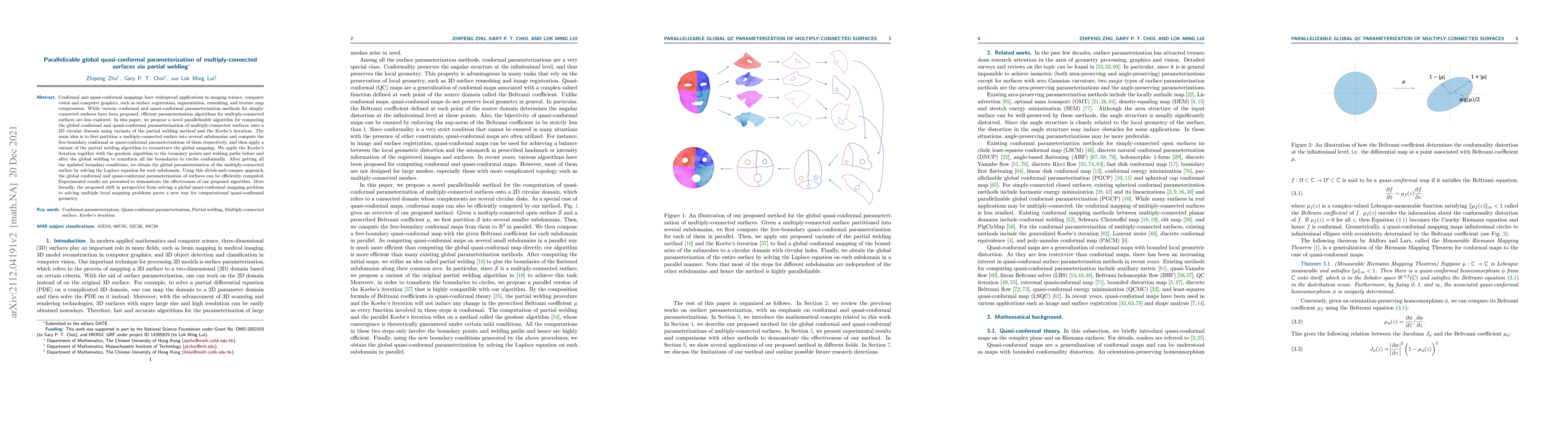 This paper introduces a parallelizable algorithm for global quasi-conformal parameterization of multiply-connected surfaces using partial welding and Koebe's iteration, efficiently dividing the surface into subdomains and solving the Laplace equation to achieve high-resolution parameterizations. The method ensures boundary transformation to circular domains, enhancing applications in computer graphics and vision.