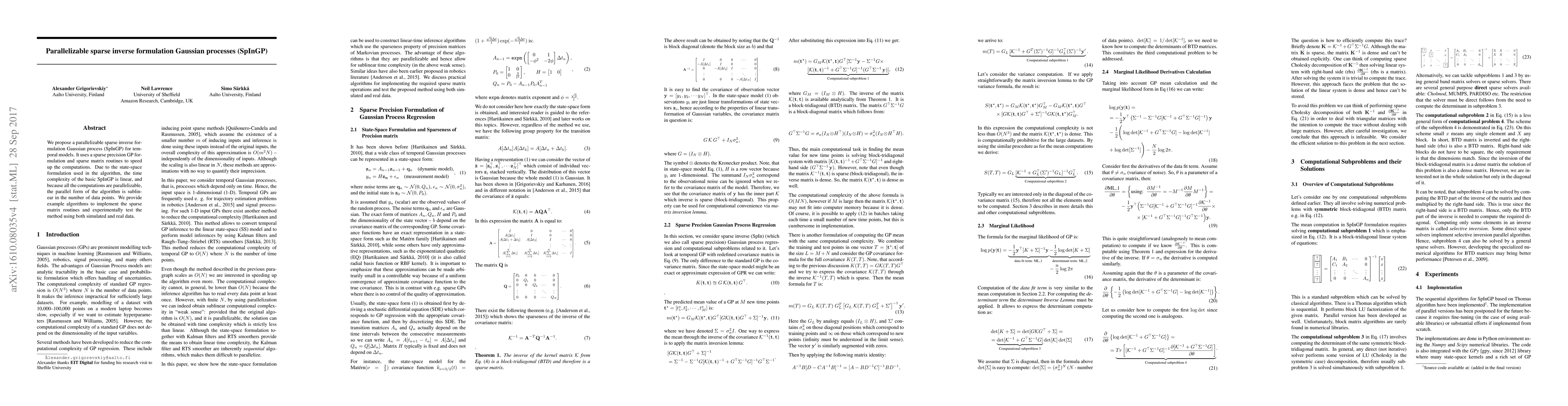 This paper introduces a parallelizable sparse inverse formulation Gaussian process (SpInGP) for temporal models, utilizing sparse precision GP and matrix routines to achieve linear time complexity and sublinear parallel performance. Experimental results on both simulated and real datasets demonstrate the method's effectiveness.