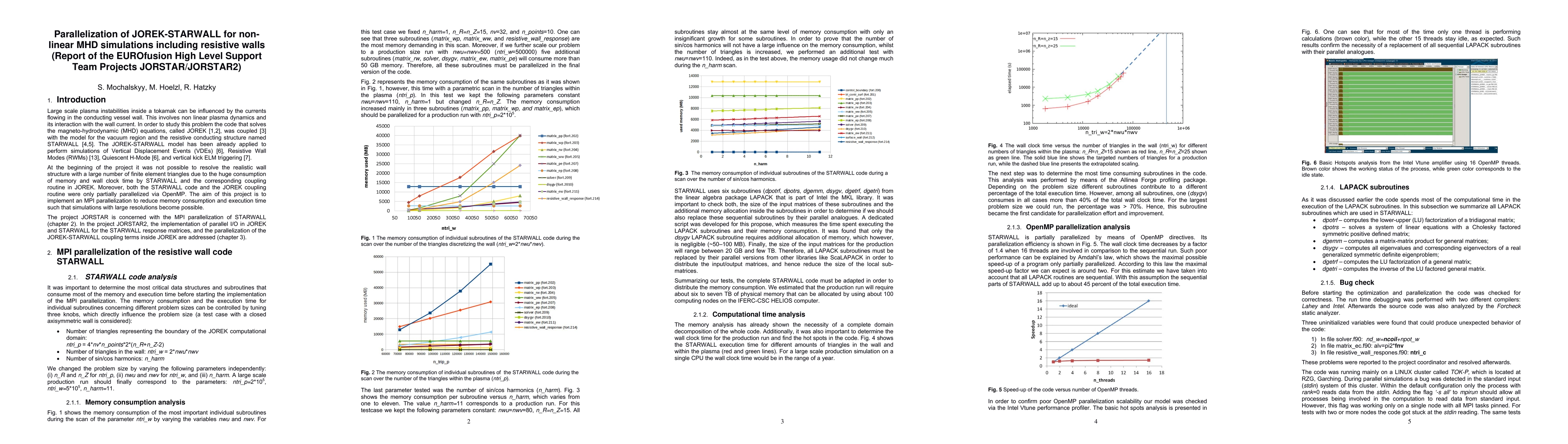 Large scale plasma instabilities inside a tokamak can be influenced by the currents flowing in the conducting vessel wall. This involves non linear plasma dynamics and its interaction with the wall current. In order to study this problem the code that solves the magneto-hydrodynamic (MHD) equations, called JOREK [Huysmans G.T.A. and Czarny O. NF 47, 659 (2007); Czarny O. and Huysmans G. JCP 227, 7423 (2008)], was coupled [Hoelzl M., et al. Journal of Physics: Conference Series, 401, 012010 (2012)] with the model for the vacuum region and the resistive conducting structure named STARWALL [Merkel P., Strumberger E., arXiv:150804911 (2015)]. The JOREK-STARWALL model has been already applied to perform simulations of Vertical Displacement Events (VDEs), Resistive Wall Modes (RWMs), Quiescent H-Mode, and vertical kick ELM triggering. At the beginning of the project it was not possible to resolve the realistic wall structure with a large number of finite element triangles due to the huge consumption of memory and wall clock time by STARWALL and the corresponding coupling routine in JOREK. Moreover, both the STARWALL code and the JOREK coupling routine were only partially parallelized via OpenMP. The aim of this project is to implement an MPI parallelization to reduce memory consumption and execution time such that simulations with large resolutions become possible.