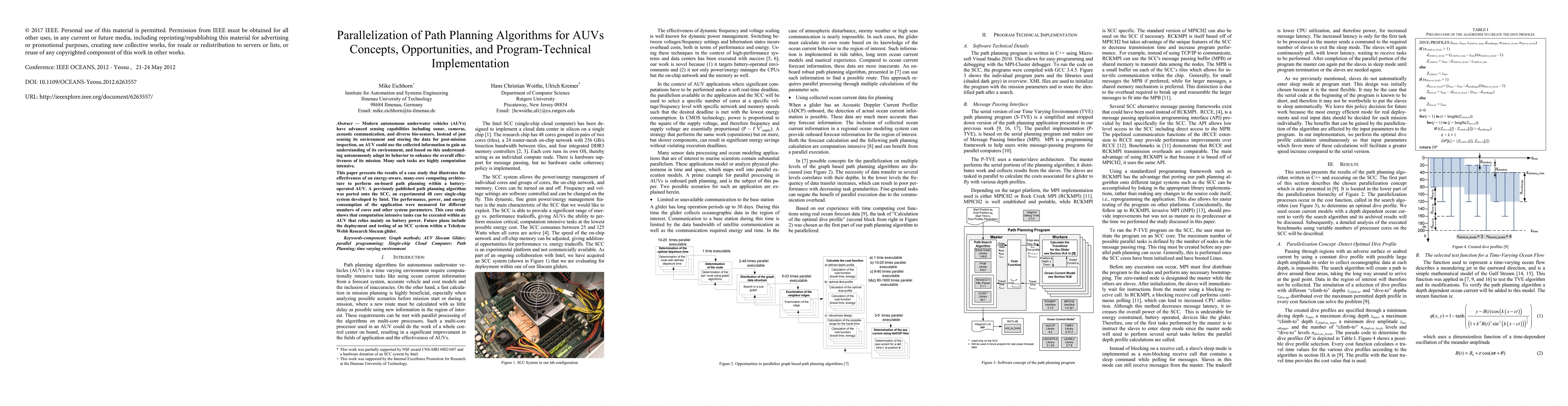 Modern autonomous underwater vehicles (AUVs) have advanced sensing capabilities including sonar, cameras, acoustic communication, and diverse bio-sensors. Instead of just sensing its environment and storing the data for post-Mission inspection, an AUV could use the collected information to gain an understanding of its environment, and based on this understanding autonomously adapt its behavior to enhance the overall effectiveness of its mission. Many such tasks are highly computation intensive. This paper presents the results of a case study that illustrates the effectiveness of an energy-aware, many-core computing architecture to perform on-board path planning within a batteryoperated AUV. A previously published path planning algorithm was ported onto the SCC, an experimental 48 core single-chip system developed by Intel. The performance, power, and energy consumption of the application were measured for different numbers of cores and other system parameters. This case study shows that computation intensive tasks can be executed within an AUV that relies mainly on battery power. Future plans include the deployment and testing of an SCC system within a Teledyne Webb Research Slocum glider.