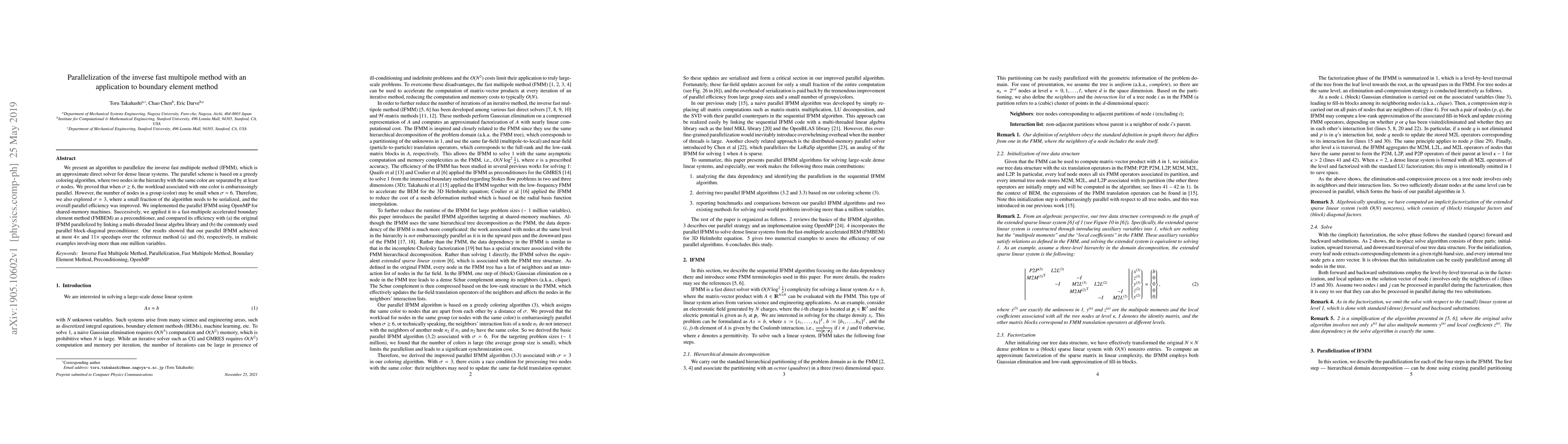 This paper presents an efficient parallel algorithm for the inverse fast multipole method (IFMM) using a greedy coloring approach, achieving significant speedups over traditional parallelization methods. The parallel IFMM is applied to accelerate boundary element method computations, demonstrating up to 11x improvement over existing preconditioners.