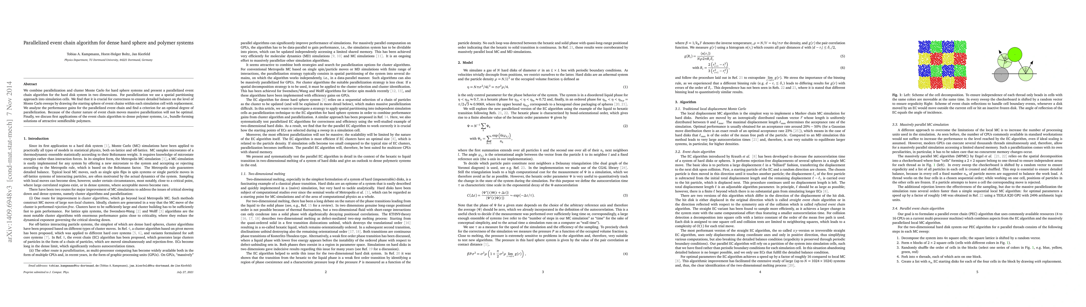 This paper introduces a parallelized event chain algorithm for simulating dense hard sphere and polymer systems using cluster Monte Carlo and spatial partitioning. The authors find that maintaining detailed balance within each simulation cell is essential for correctness, and they identify an optimal degree of parallelization due to the cluster nature of event chain moves.
