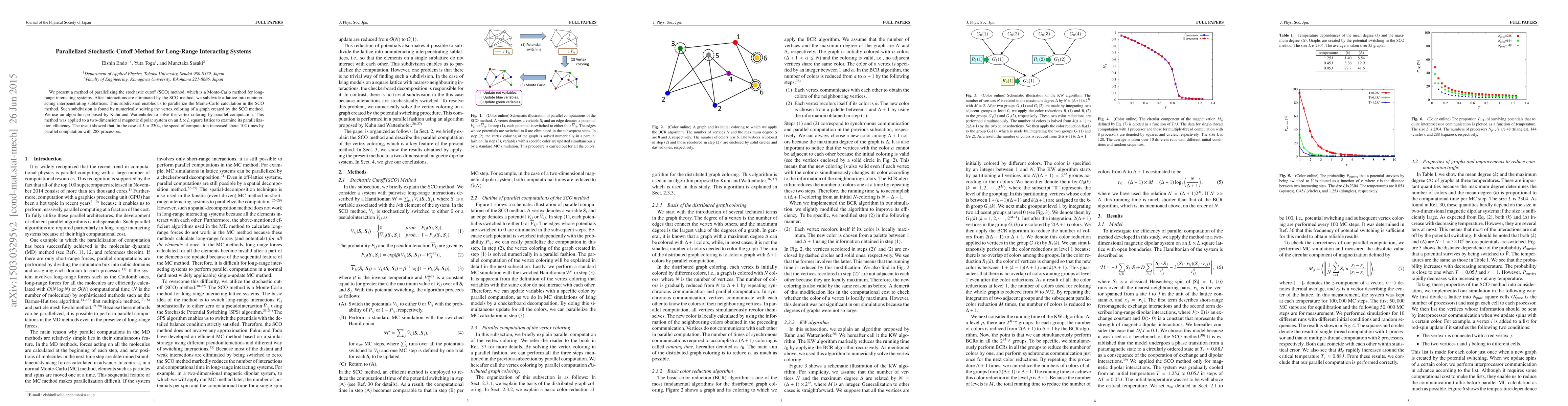 This paper introduces a parallelized version of the stochastic cutoff method for Monte-Carlo simulations of long-range interacting systems, utilizing vertex coloring algorithms to subdivide lattices for parallel computation. The method demonstrated a 102-fold speedup in a 2D magnetic dipolar system simulation using 288 processors.