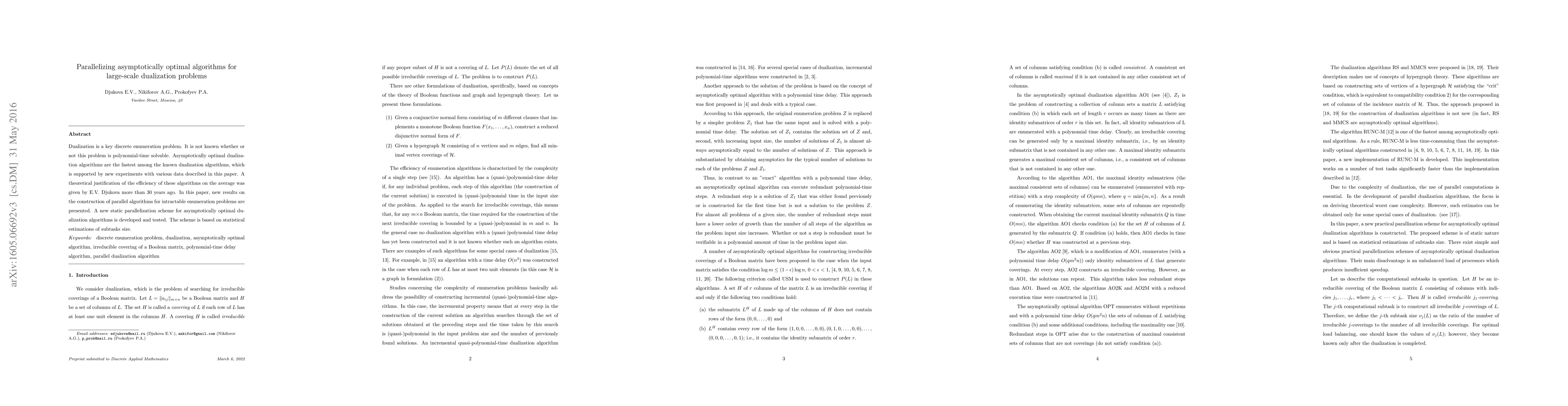Dualization is a key discrete enumeration problem. It is not known whether or not this problem is polynomial-time solvable. Asymptotically optimal dualization algorithms are the fastest among the known dualization algorithms, which is supported by new experiments with various data described in this paper. A theoretical justification of the efficiency of these algorithms on the average was given by E.V. Djukova more than 30 years ago. In this paper, new results on the construction of parallel algorithms for intractable enumeration problems are presented. A new static parallelization scheme for asymptotically optimal dualization algorithms is developed and tested. The scheme is based on statistical estimations of subtasks size.