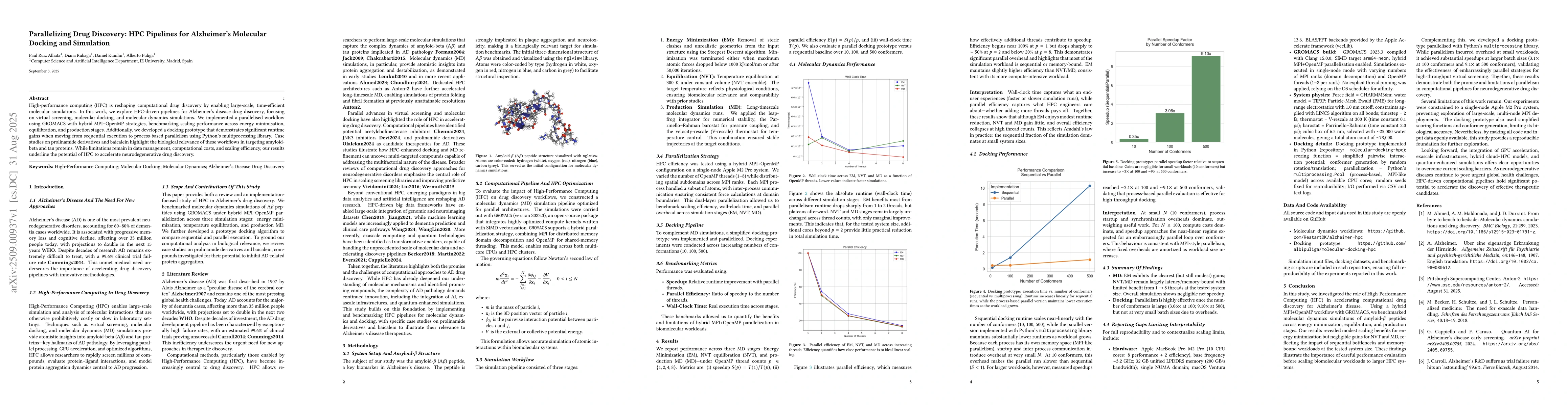 High-performance computing (HPC) is reshaping computational drug discovery by enabling large-scale, time-efficient molecular simulations. In this work, we explore HPC-driven pipelines for Alzheimer's disease drug discovery, focusing on virtual screening, molecular docking, and molecular dynamics simulations. We implemented a parallelised workflow using GROMACS with hybrid MPI-OpenMP strategies, benchmarking scaling performance across energy minimisation, equilibration, and production stages. Additionally, we developed a docking prototype that demonstrates significant runtime gains when moving from sequential execution to process-based parallelism using Python's multiprocessing library. Case studies on prolinamide derivatives and baicalein highlight the biological relevance of these workflows in targeting amyloid-beta and tau proteins. While limitations remain in data management, computational costs, and scaling efficiency, our results underline the potential of HPC to accelerate neurodegenerative drug discovery.