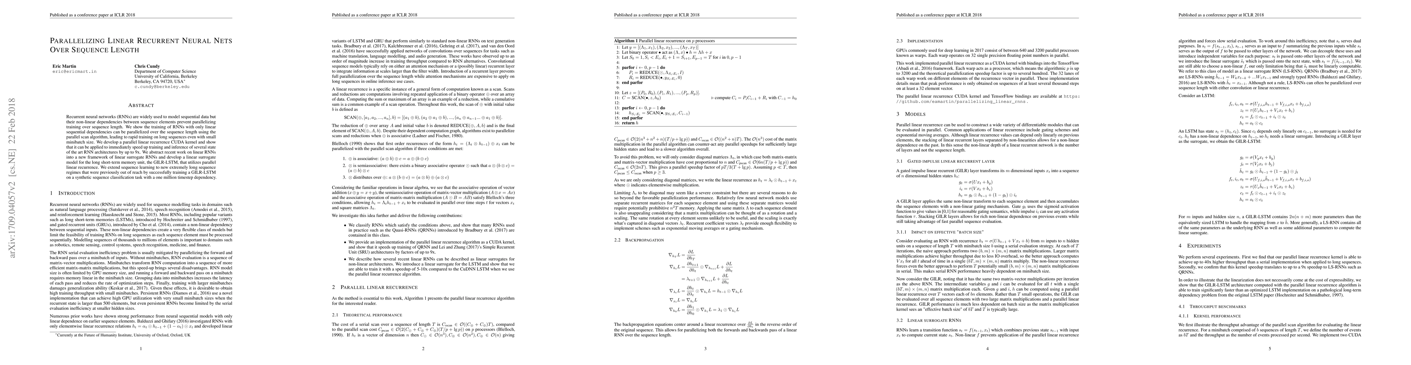 Recurrent neural networks (RNNs) are widely used to model sequential data but their non-linear dependencies between sequence elements prevent parallelizing training over sequence length. We show the training of RNNs with only linear sequential dependencies can be parallelized over the sequence length using the parallel scan algorithm, leading to rapid training on long sequences even with small minibatch size. We develop a parallel linear recurrence CUDA kernel and show that it can be applied to immediately speed up training and inference of several state of the art RNN architectures by up to 9x. We abstract recent work on linear RNNs into a new framework of linear surrogate RNNs and develop a linear surrogate model for the long short-term memory unit, the GILR-LSTM, that utilizes parallel linear recurrence. We extend sequence learning to new extremely long sequence regimes that were previously out of reach by successfully training a GILR-LSTM on a synthetic sequence classification task with a one million timestep dependency.