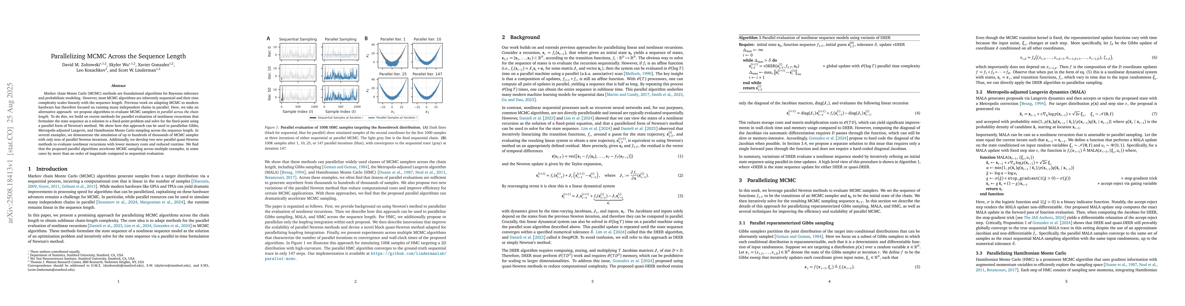 Markov chain Monte Carlo (MCMC) methods are foundational algorithms for Bayesian inference and probabilistic modeling. However, most MCMC algorithms are inherently sequential and their time complexity scales linearly with the sequence length. Previous work on adapting MCMC to modern hardware has therefore focused on running many independent chains in parallel. Here, we take an alternative approach: we propose algorithms to evaluate MCMC samplers in parallel across the chain length. To do this, we build on recent methods for parallel evaluation of nonlinear recursions that formulate the state sequence as a solution to a fixed-point problem and solve for the fixed-point using a parallel form of Newton's method. We show how this approach can be used to parallelize Gibbs, Metropolis-adjusted Langevin, and Hamiltonian Monte Carlo sampling across the sequence length. In several examples, we demonstrate the simulation of up to hundreds of thousands of MCMC samples with only tens of parallel Newton iterations. Additionally, we develop two new parallel quasi-Newton methods to evaluate nonlinear recursions with lower memory costs and reduced runtime. We find that the proposed parallel algorithms accelerate MCMC sampling across multiple examples, in some cases by more than an order of magnitude compared to sequential evaluation.
