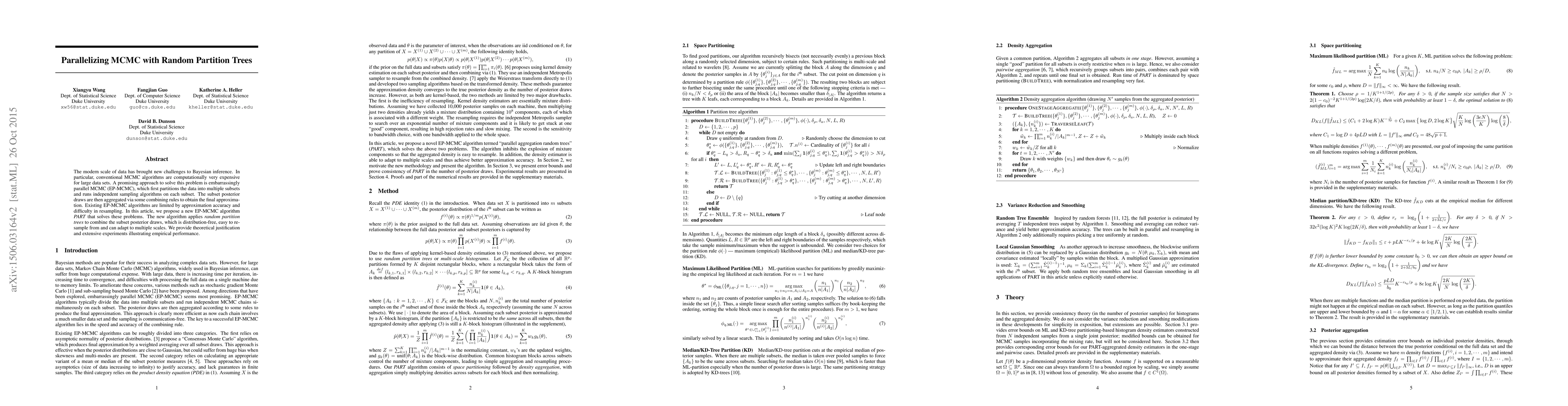 This paper proposes a new embarrassingly parallel MCMC (EP-MCMC) algorithm called PART that uses random partition trees to combine subset posterior draws, addressing limitations in accuracy and resampling. Theoretical justification and empirical experiments demonstrate its effectiveness.