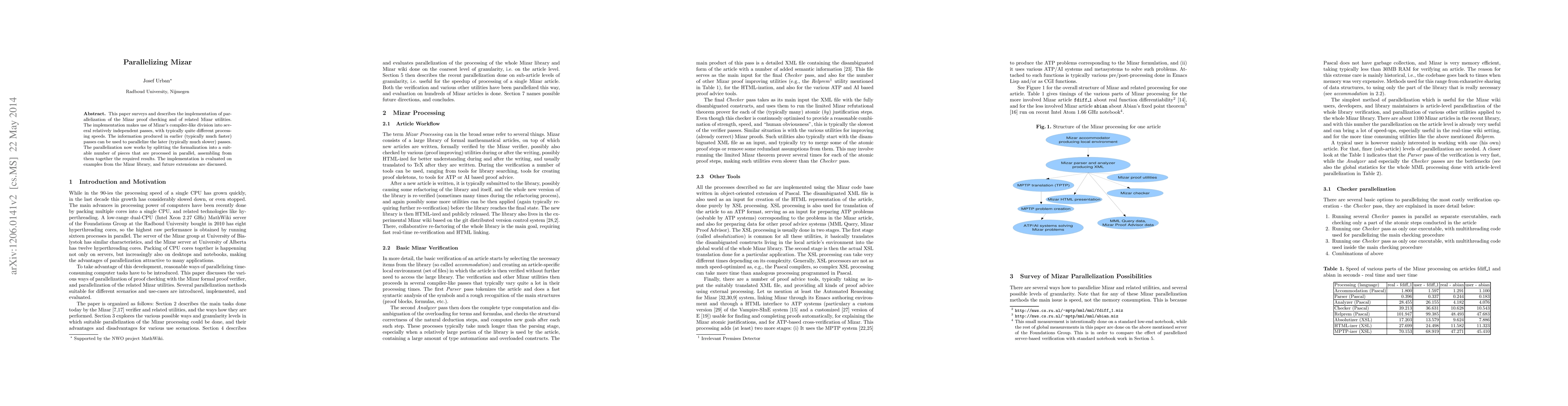 This paper details the parallelization of Mizar's proof checking and utilities, leveraging its multi-pass structure to optimize processing speed. The implementation splits formalizations into parallel tasks, evaluates its performance on Mizar library examples, and discusses future enhancements.